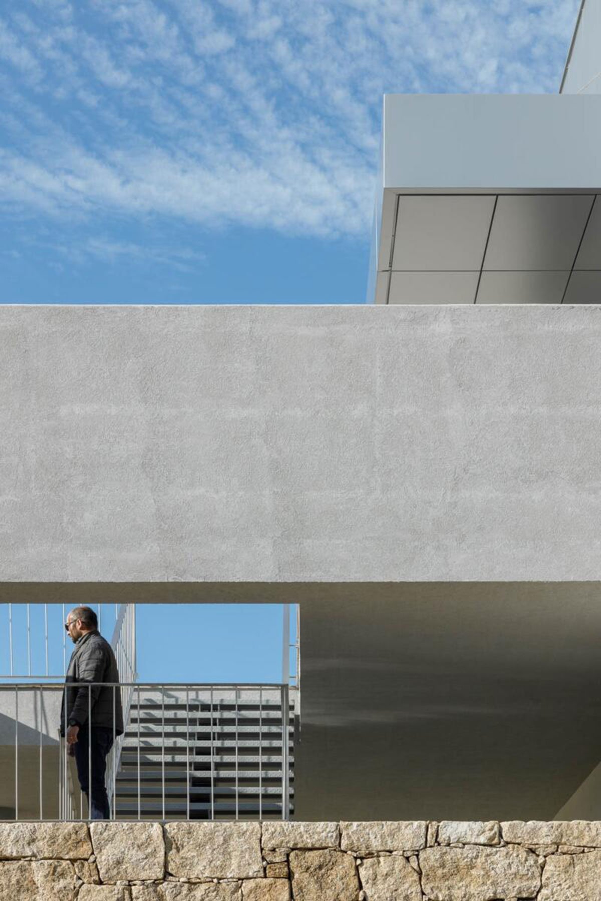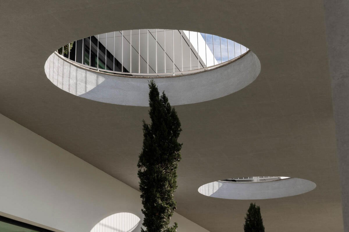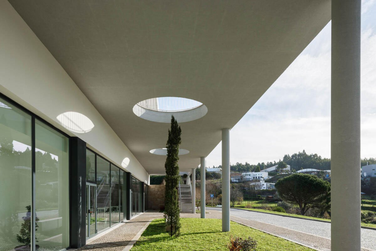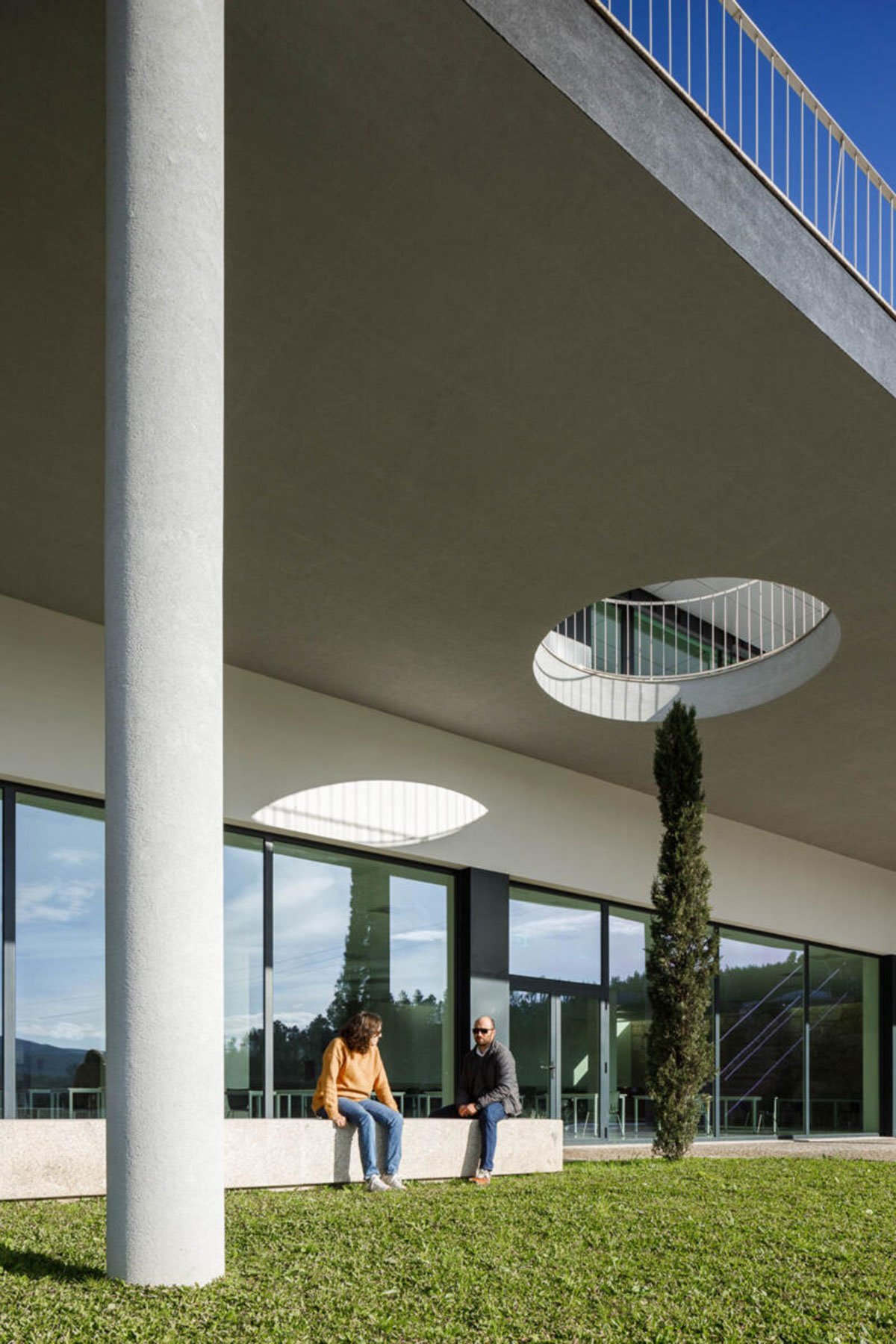 The basement floor is the floor of the main entrance to the building. It cohabits with two fundamental spaces: the entrance hall and one of the meeting rooms. Unlike the top floor, which occupies the entire shape of the implantation (rectangle), it occupies only part of it essentially for morphological reasons. At the solar level it helps with the south, east and west side. The balcony also has a leading role on the entrance floor. It works as a “visor” for this space. A space for living, contemplating the landscape, distracting, where a massive stone bench remains, as if it were a landmark of the landscape. Around it, a green area punctuated by two cypress trees that rise through two circular slots communicating with the balcony and at the same time presenting it with more dynamism and different types of light.
