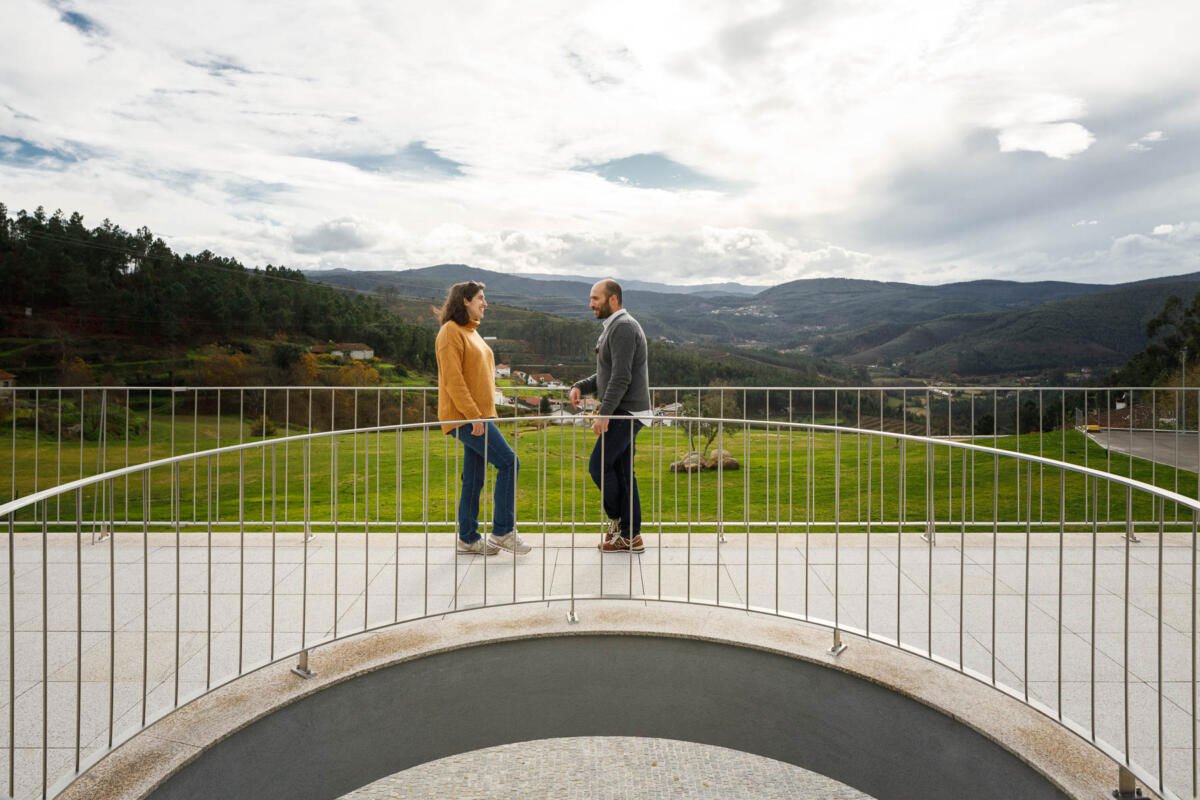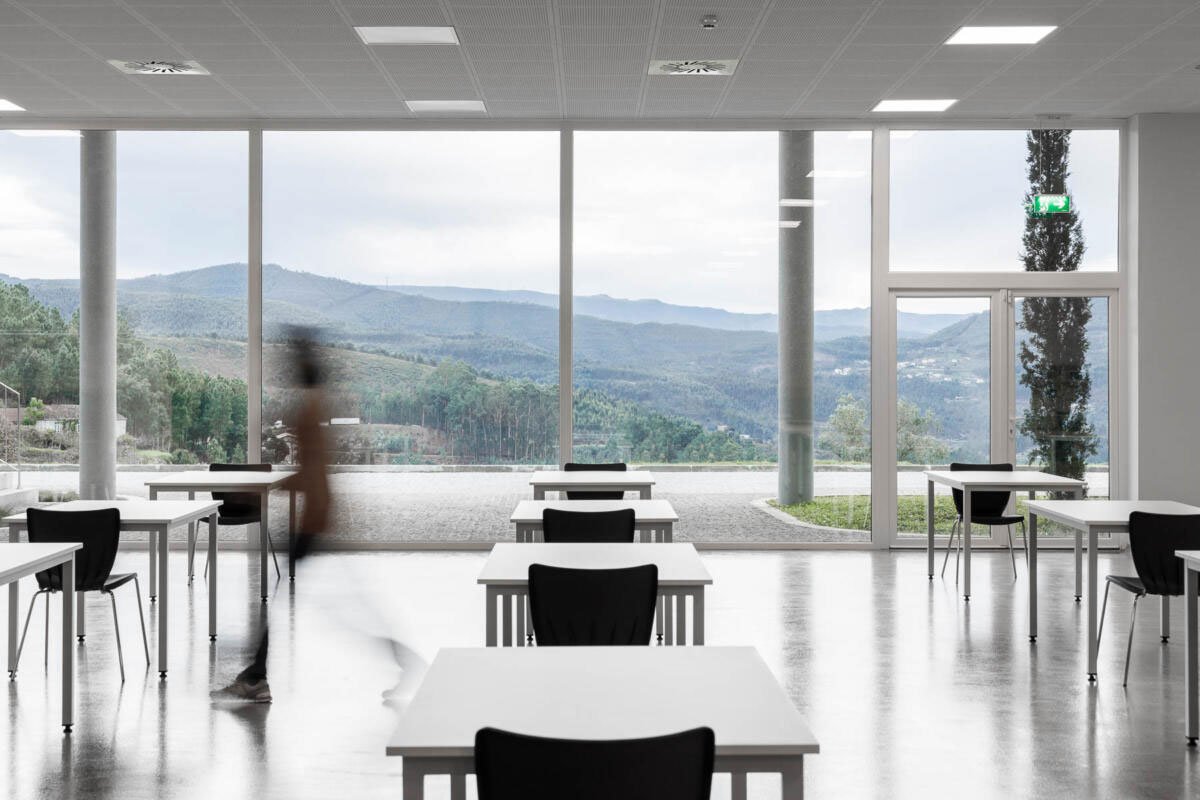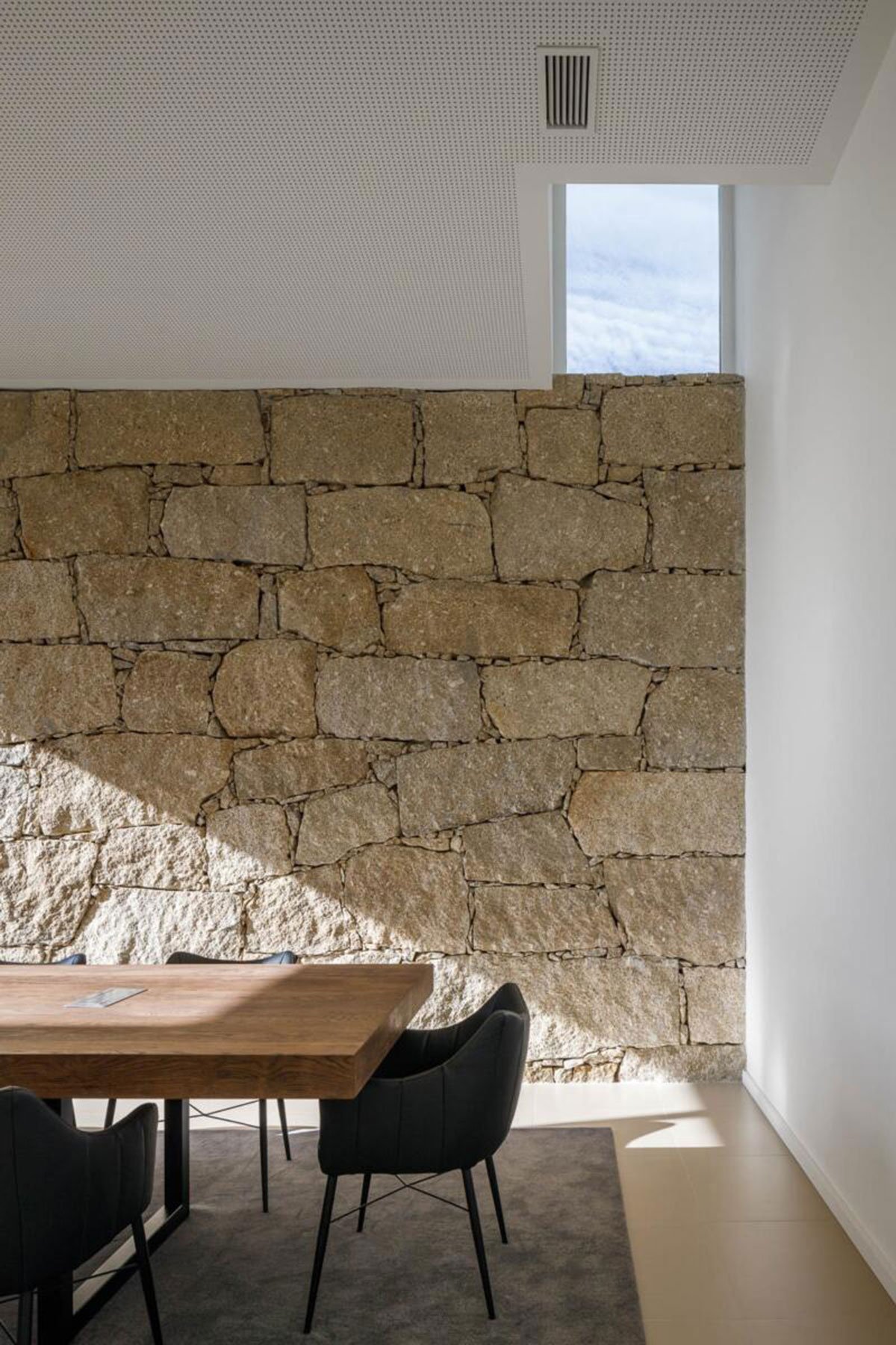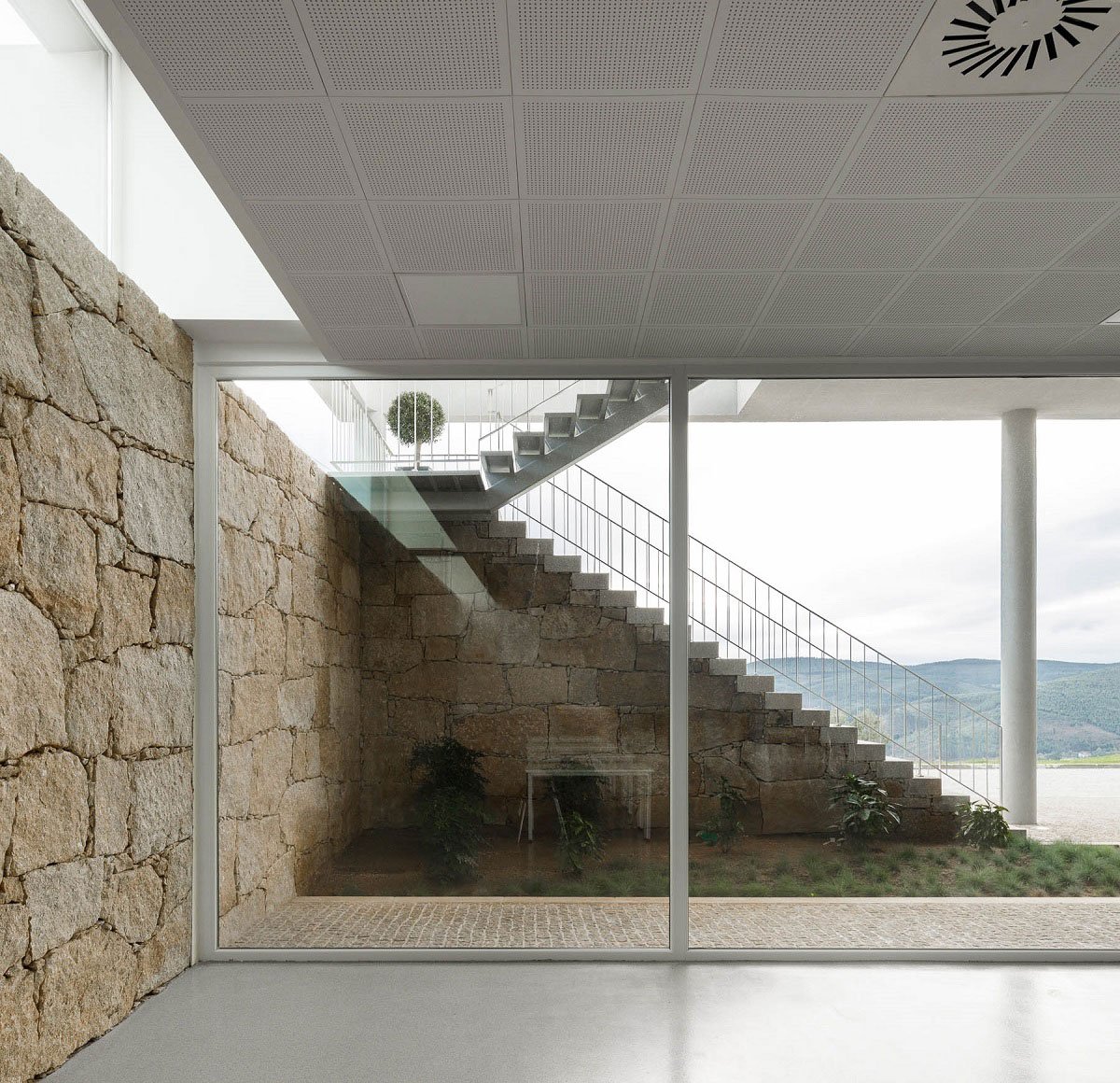 The basement floor is the floor of the main entrance to the building. It cohabits with two fundamental spaces: the entrance hall and one of the meeting rooms. Unlike the top floor, which occupies the entire shape of the implantation (rectangle), it occupies only part of it essentially for morphological reasons. At the solar level it helps with the south, east and west side. The balcony also has a leading role on the entrance floor. It works as a “visor” for this space. A space for living, contemplating the landscape, distracting, where a massive stone bench remains, as if it were a landmark of the landscape. Around it, a green area punctuated by two cypress trees that rise through two circular slots communicating with the balcony and at the same time presenting it with more dynamism and different types of light.