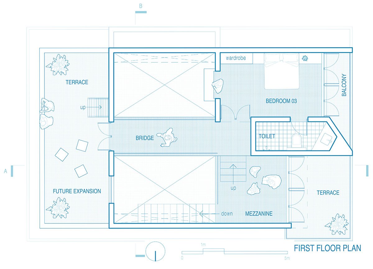 The first floor of Bridge Bungalow offers respite and tranquility, boasting a bedroom with an attached toilet, balcony, terrace, and space for integrated future expansion.