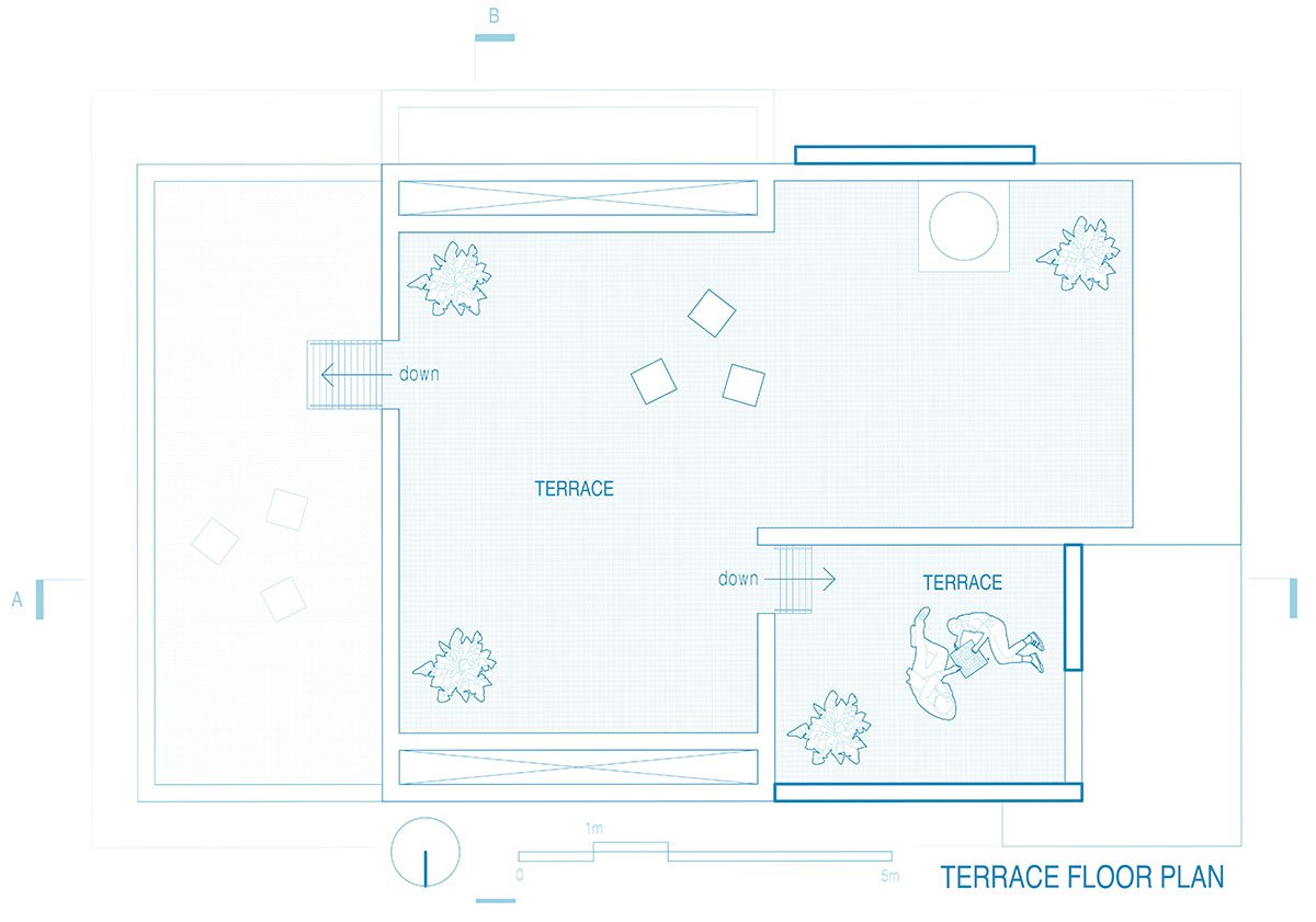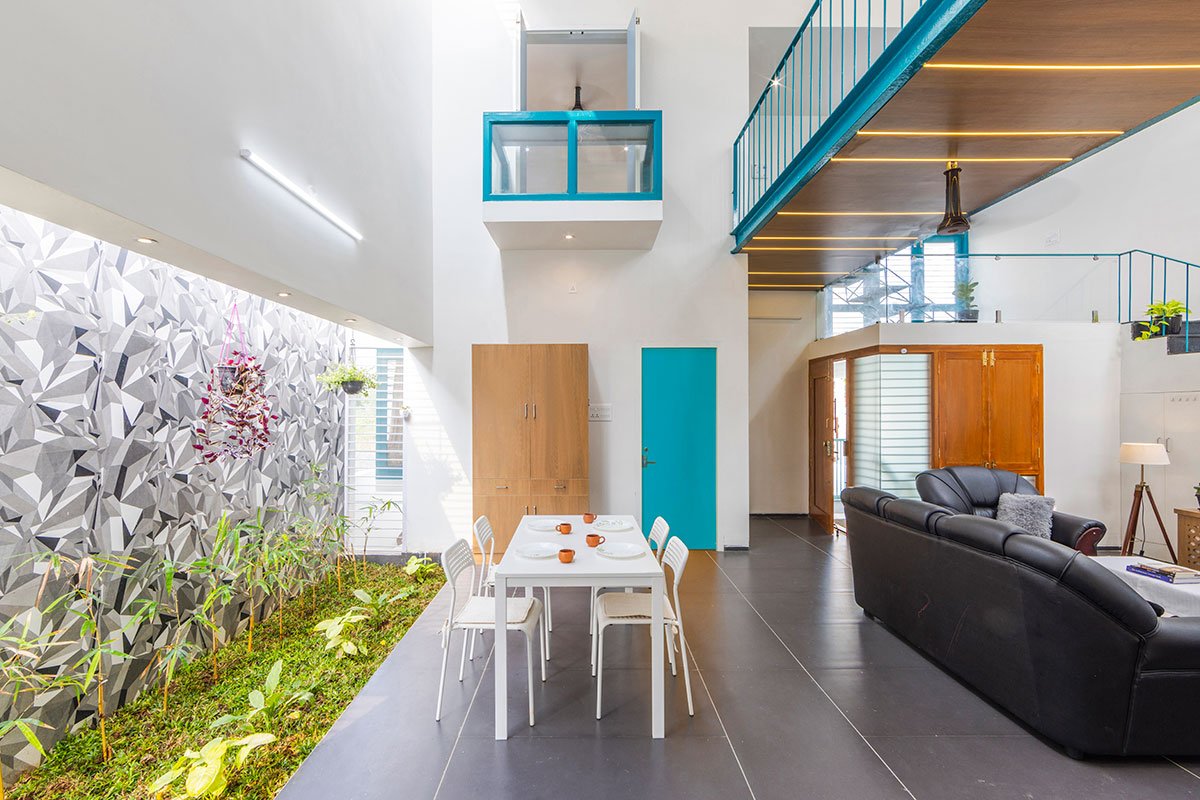 A cantilevered workstation graces the first-floor bedroom, offering a secluded yet connected space that overlooks the verdant garden and bustling living area below. This ensures seamless integration with the surrounding environment, allowing occupants to remain engaged with their surroundings while pursuing their tasks.