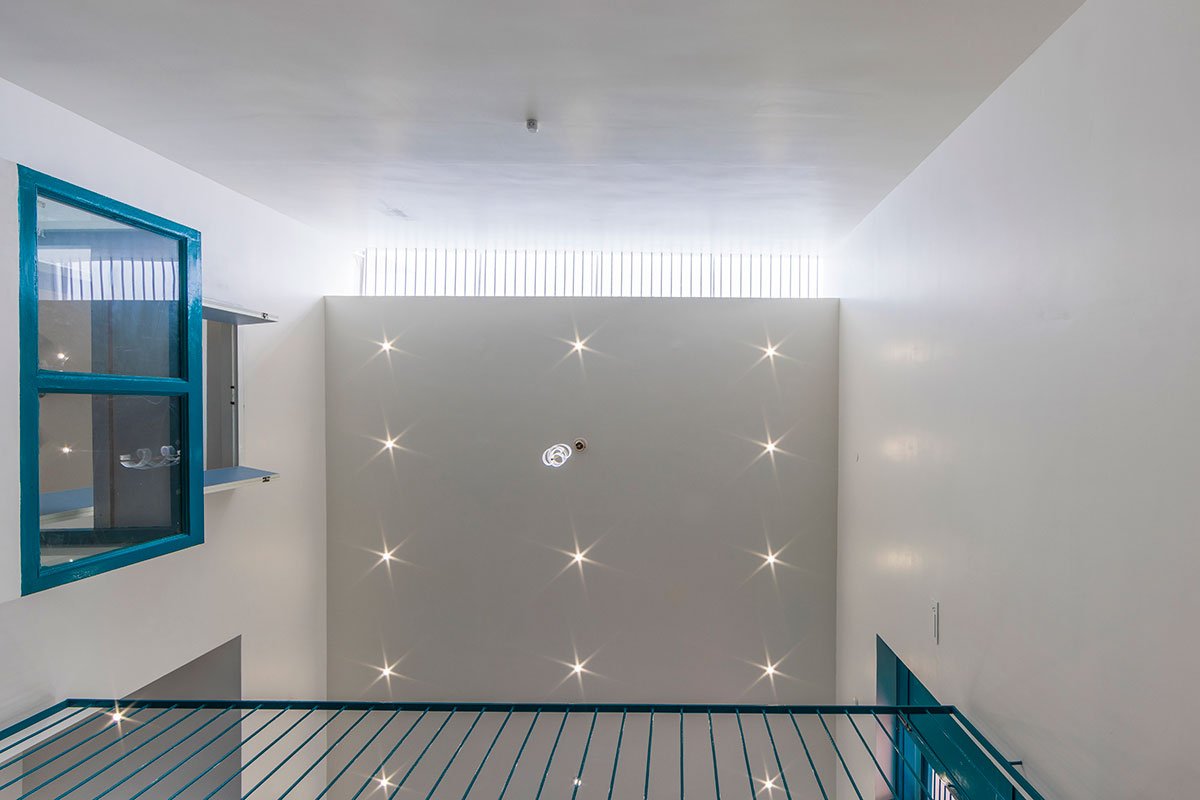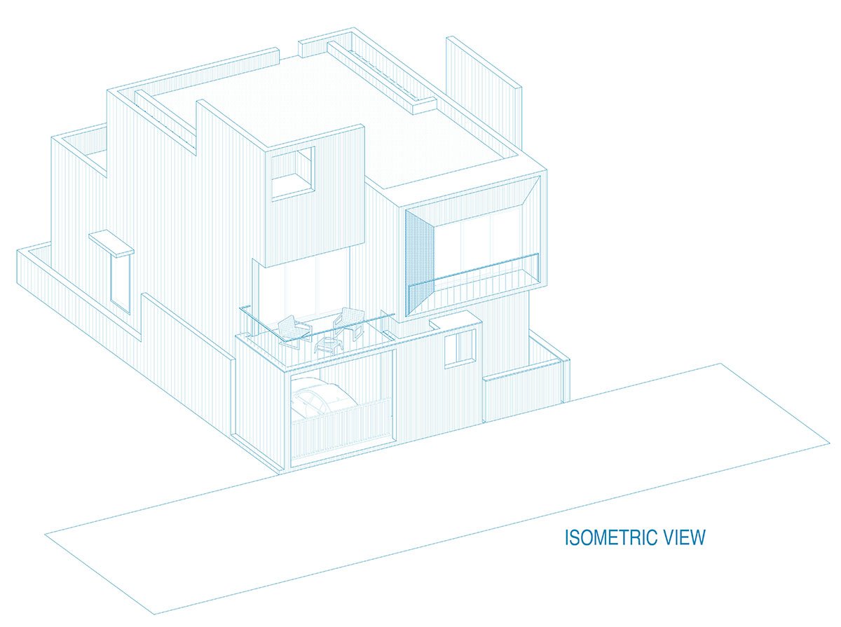 Inside, an open-plan layout beckons, inviting uninterrupted airflow and visual connectivity throughout. The ground floor plays host to essential living spaces, including a parking area, living room, kitchen, dining area, and two bedrooms with attached toilets. A narrow green court extends from the living room, adorned with patterned tiles and illuminated by strategically placed skylights that not only bathe the space in sunlight but also facilitate passive cooling through the stack effect.