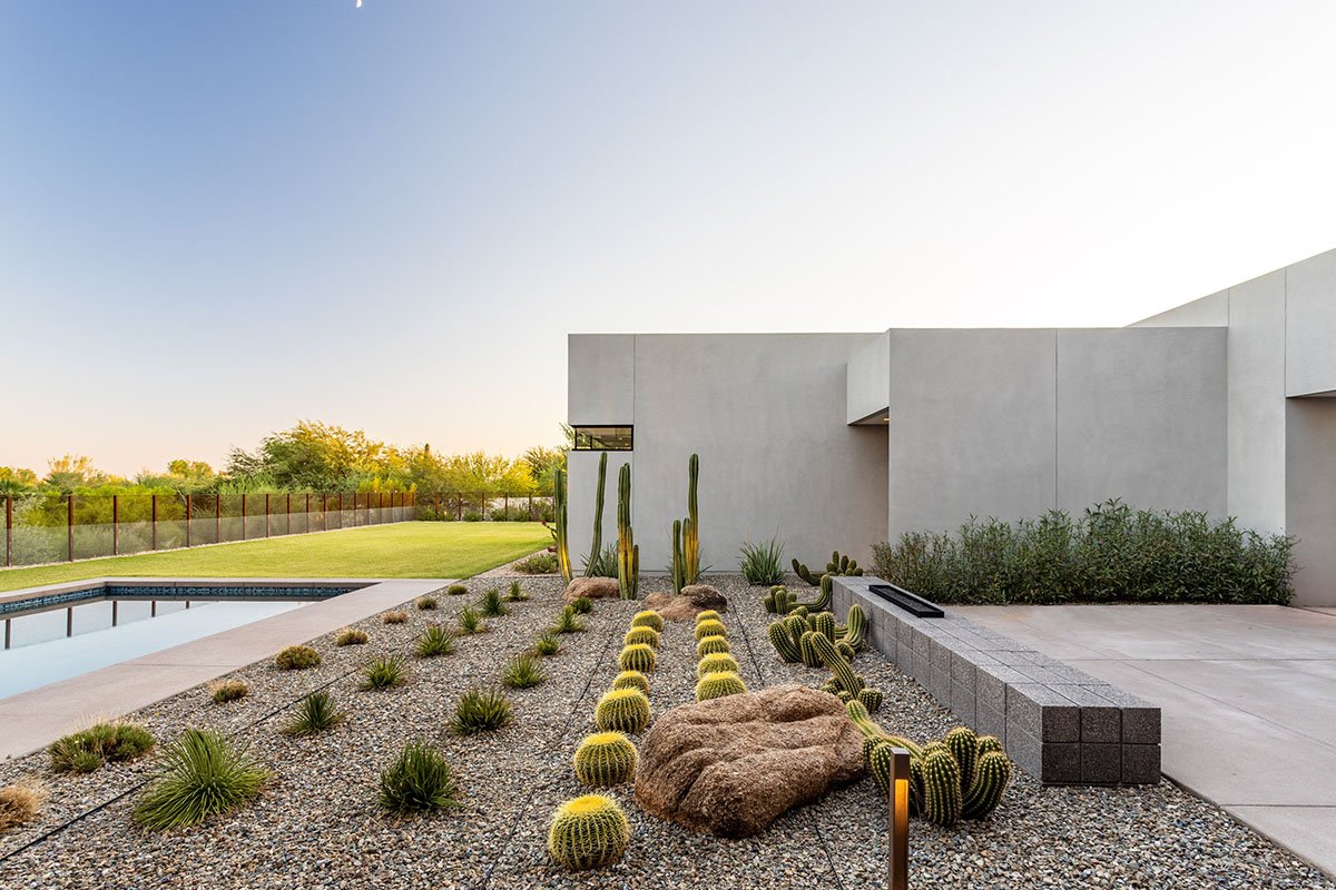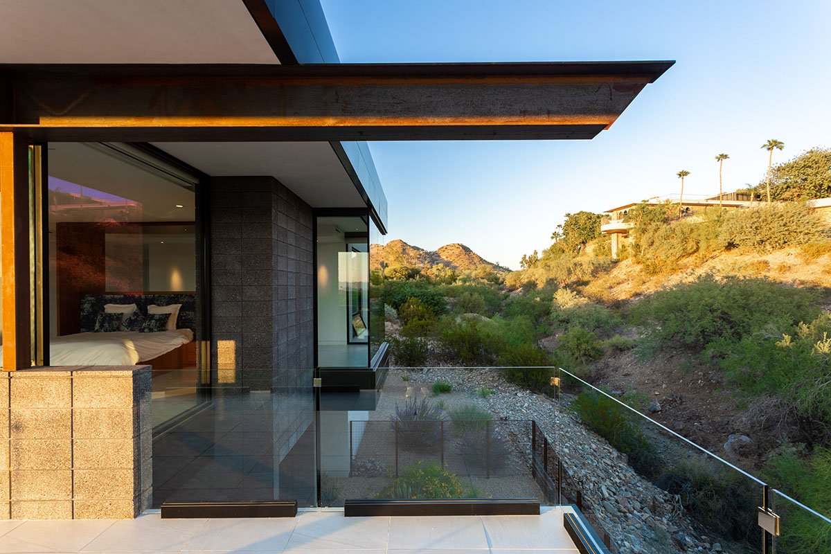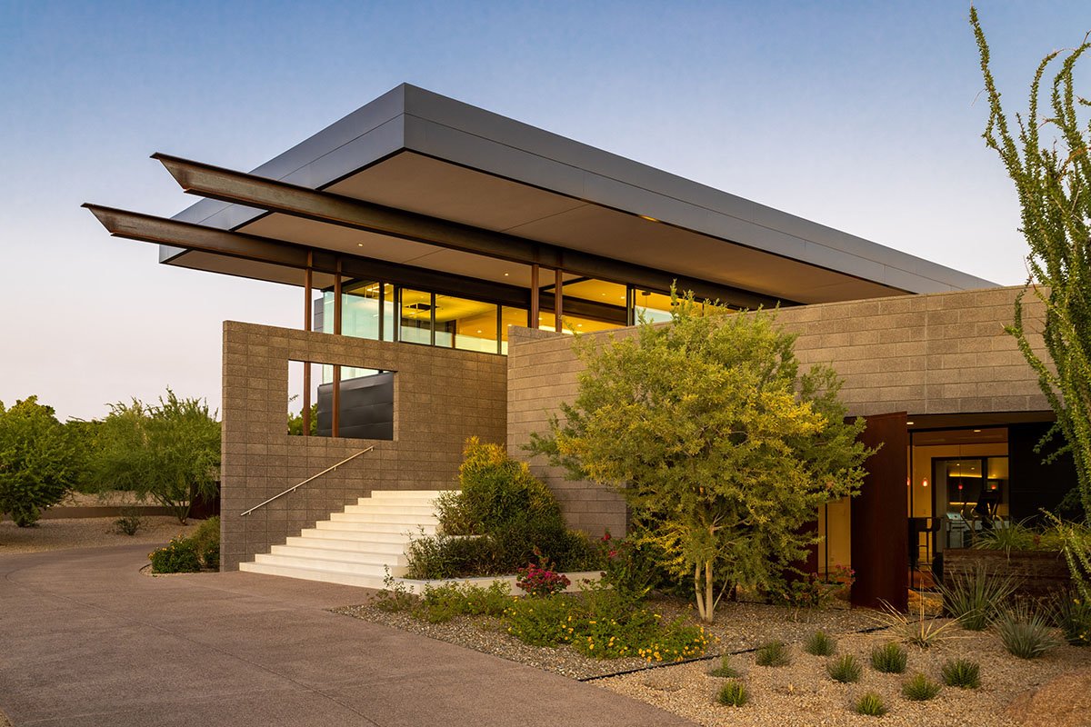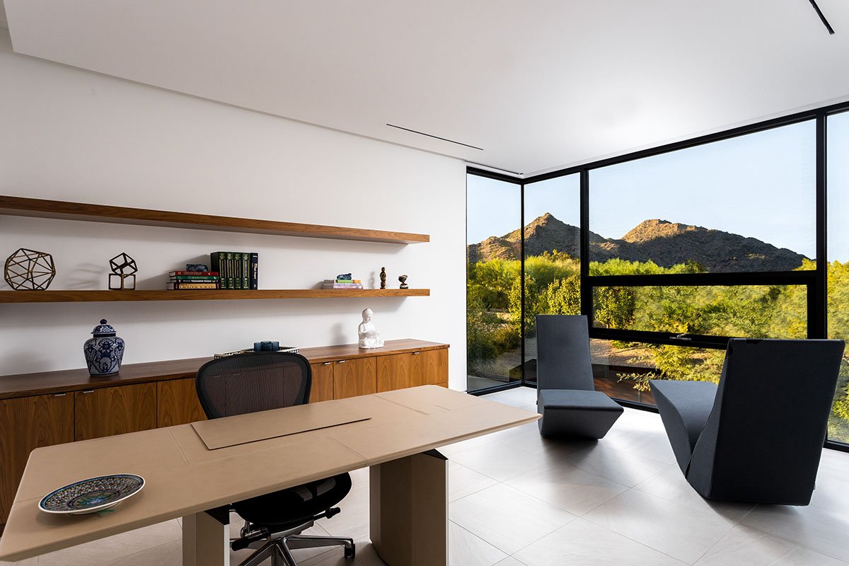 The desert wash, viewed by many as an obstacle to be avoided, is instead celebrated as a focal feature, providing a glimpse into the surrounding indigenous plant and wildlife while preserving an unobstructed view corridor towards the valley below. Casual entertainment and family areas, located on the ground level, focus on private outdoor areas along the desert wash.