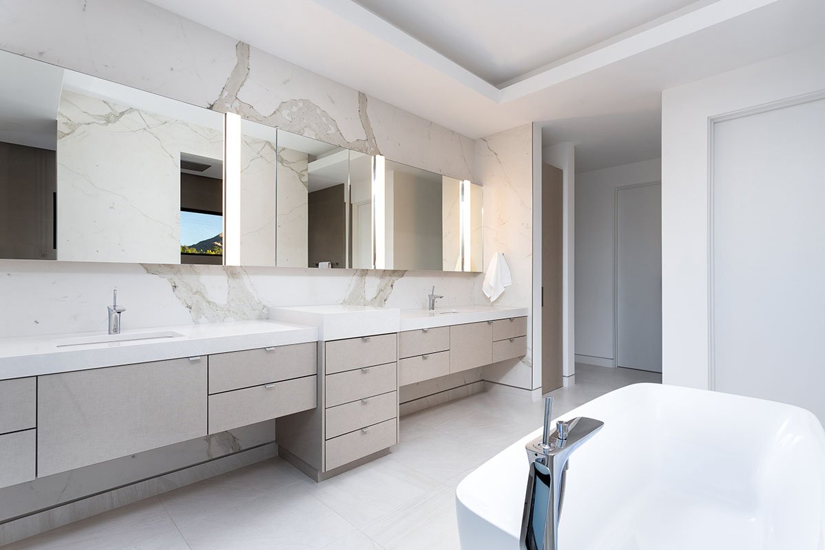 A back-kitchen provides ample room for preparation before and clean-up after dinners freeing up the front kitchen to remain an attractive social hub. Main living and master suite functions are located on the second level to take in surrounding views not afforded in single level design. The master suite is designed to take in the valley views. A steel and stone fireplace conceals a TV on the inside while providing warmth to the outside sitting area.