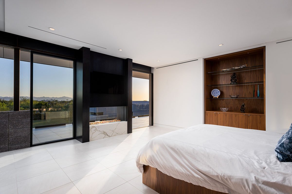[Text as submitted by architect] This site posed unique features and challenges including a natural desert wash with an abrupt edge and a significant drop in elevation, a corner lot condition that imposed larger setbacks as well as Hillside Zoning that imposes greater building envelope restrictions. The owner’s goal was to design a family home with mountain and valley views similar to that of a hillside location, but on a lot with minimal elevation. Our response organizes the home in two levels with the main living spaces and master suite located on the second level affording spectacular mountain, valley, and city views while bridging across a lower level composed of children’s and guest suites along with indoor and outdoor activity areas.
