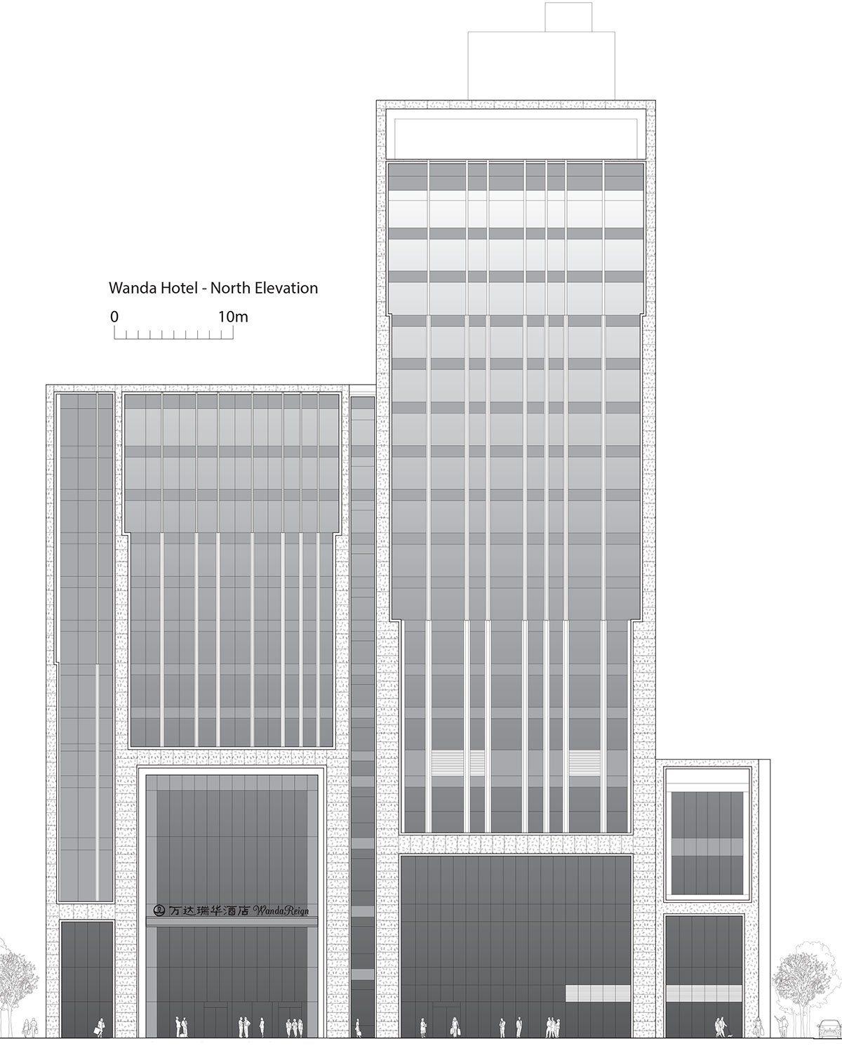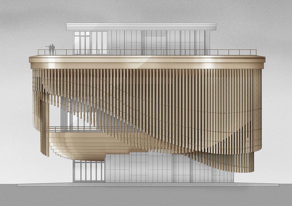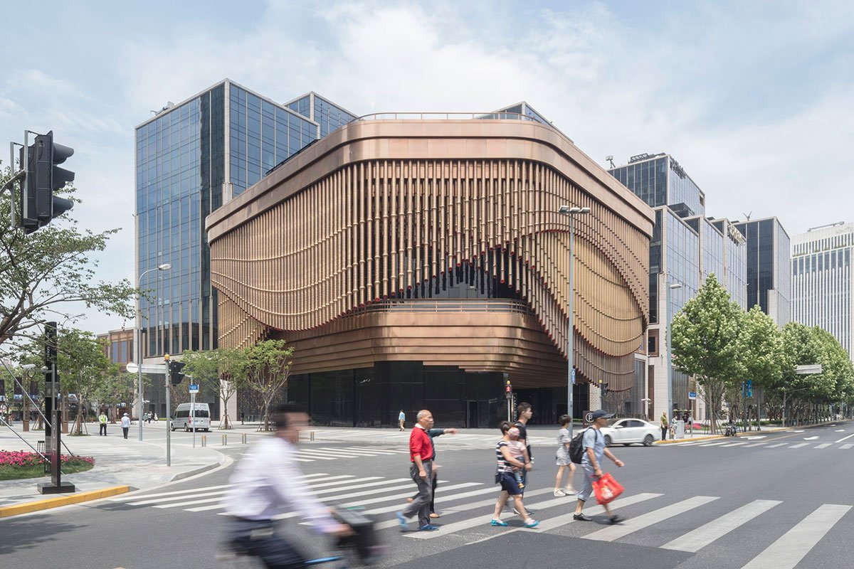 The social focus of the scheme is the cultural centre, conceived as a platform for international arts and cultural exchange, as well as a place for brand events, product launches and corporate functions. The building is encircled by a moving veil, which adapts to the changing use of the building and reveals the stage on the balcony and views towards Pudong. Developed in collaboration with local engineers Tongji University, the façade is a veil organised along three tracks and made up of layers of 675 individual magnesium alloy ‘tassels’ – a reference to the traditional Chinese bridal headdress. The