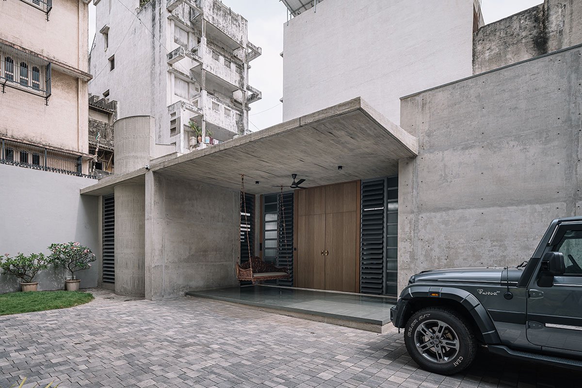 [Text as submitted by architect] The landscape of the old cities of India is continuously seeing a rapid change in response to the congestion, design practices and fast emulation of residences. The residents often face issues with privacy, upgraded living standards and even with a bare necessity like parking, and so was the case with the client, Mr. Rushabh. Rather than relocating from the old city of Surat, the client favoured residing at his old home by extending the structure rather than rebuilding it from scratch, rendering a clear design brief for the architects.