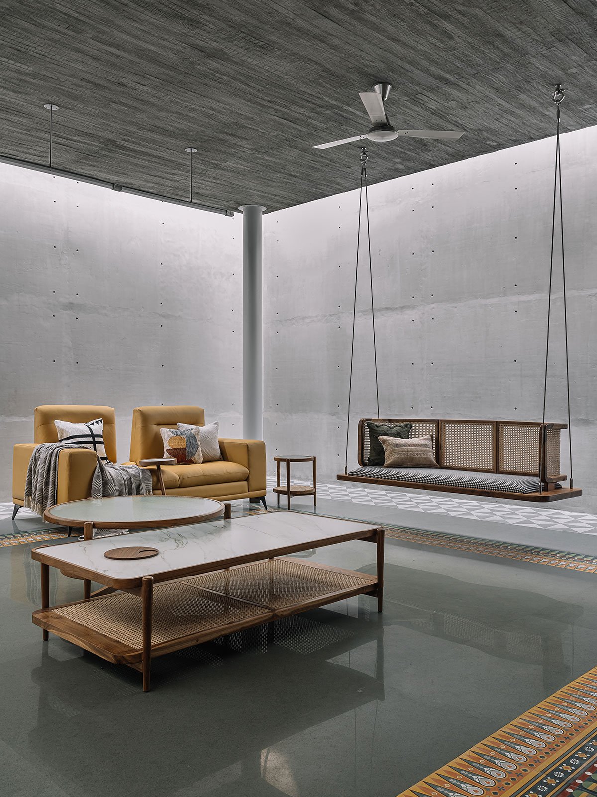 Parts of their reminiscence for their old home and culture has made a comeback in the way of the interior decor. The swing at the entrance otla is a reminder of his heirloom. The sofa and other furniture have been made on site. Choice of wood gives a plush look and imparts a traditional feel. Combining contemporary and minimalistic aesthetics, a touch of teak wood effortlessly complements the monochromatic RCC slabs and polished kota flooring. The Pichwai art at the pooja is a cue to our rich ethnicity.