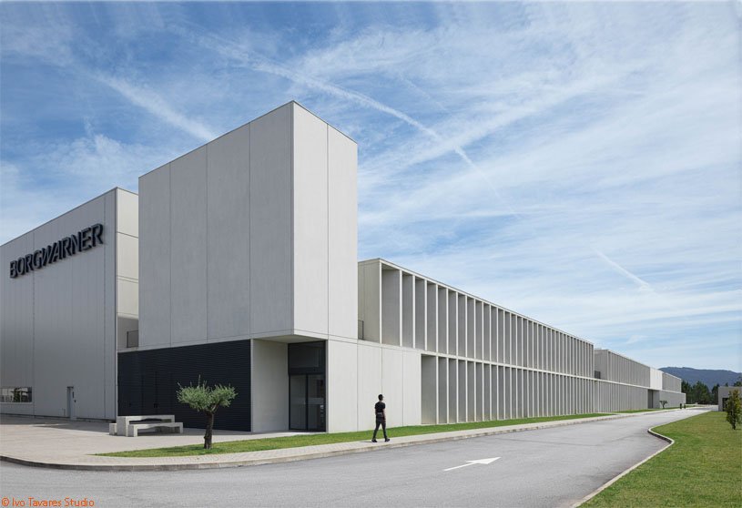[Text as submitted by architect] The Industrial Building in Viana do Castelo project consists of a new industrial unit in Lanheses, Viana do Castelo, and is made up of two apparently autonomous volumes with different heights. The first volume – a large industrial/warehousing/technical area with a canopy protecting the shipping area. The second volume – a social and administrative area, comprising 2 floors above the ground level and “drawing” the main elevation of the building.