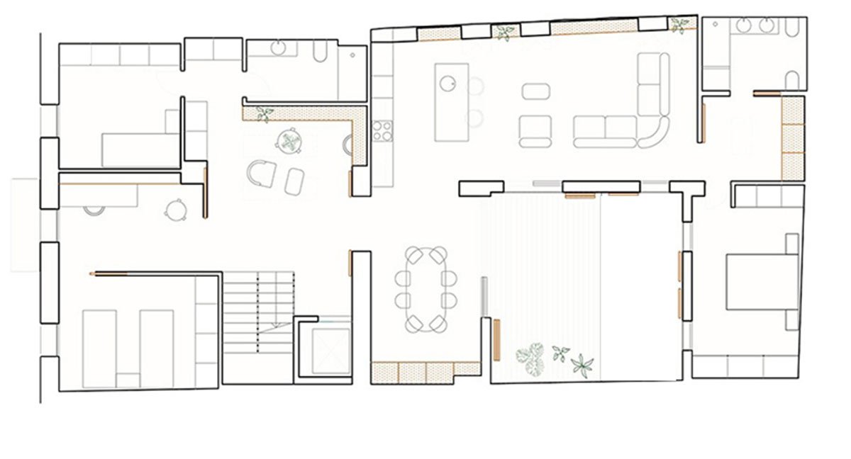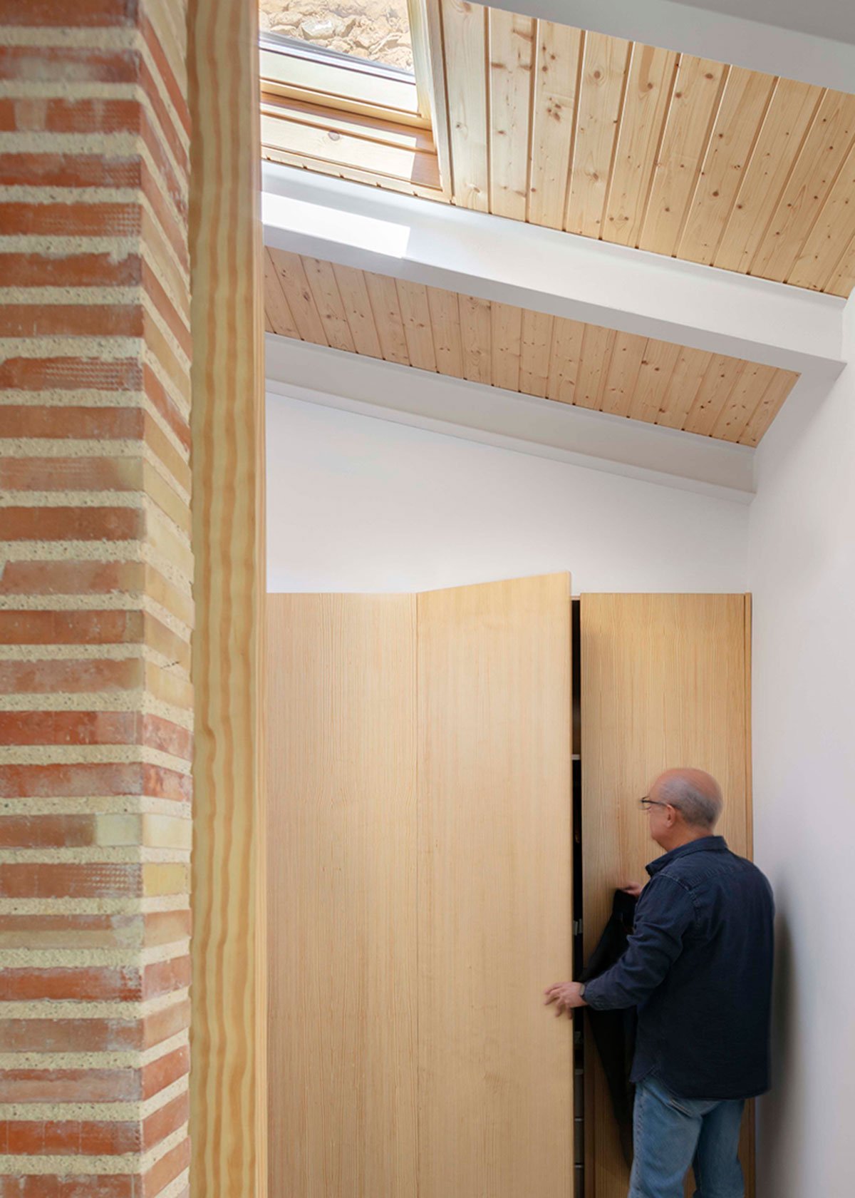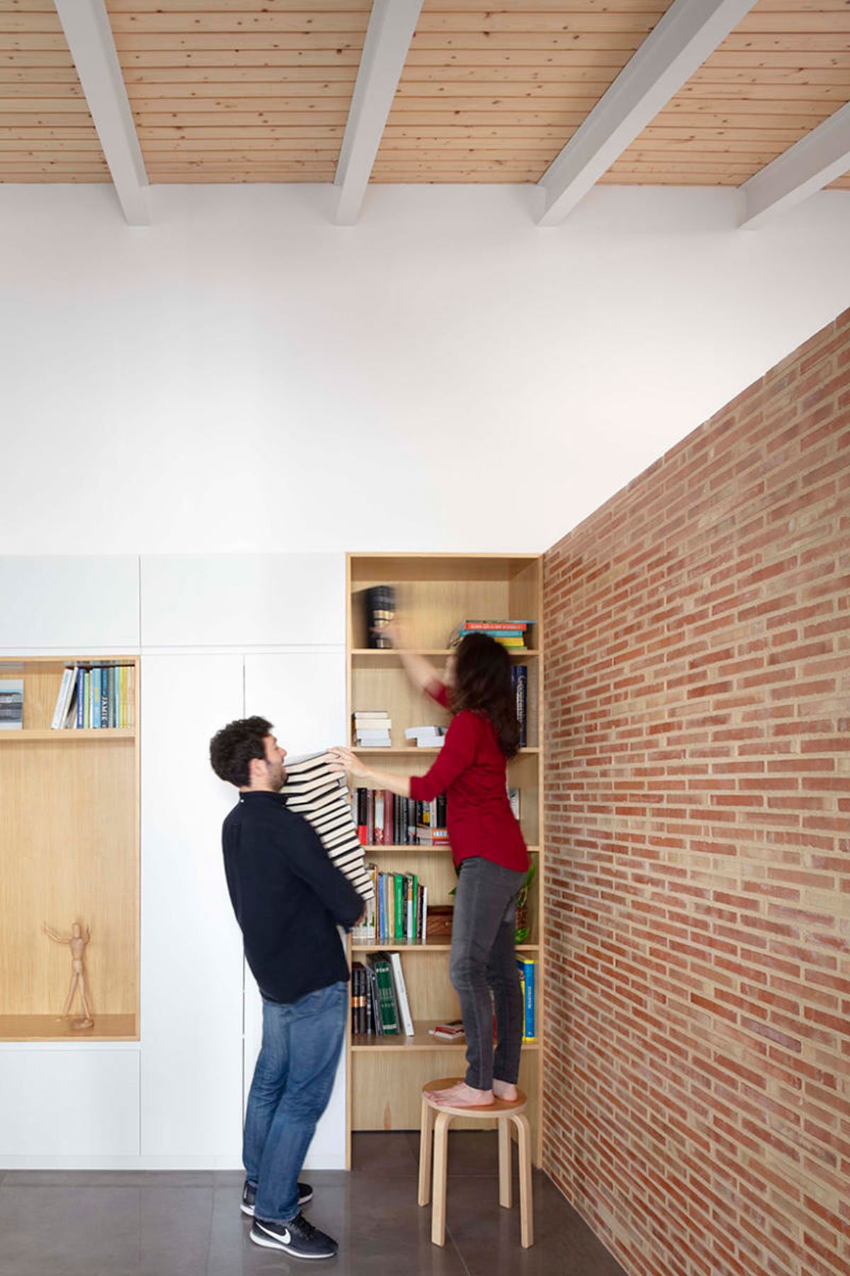 This house tells us about the people who live there. On the first floor, the stair is welcoming a common space that articulates the hierarchy of the house. Here two different environments appear. On the left side the sons can find their place, and on the other side the adults have their own spaces. The open plan is now organized with sliding doors, which bring these spaces together, becoming a continuous space and allowing each inhabitant to occupy his place and adapt his surroundings to his own way of life. The rooms are emptied and the perimeter is built with ‘thick walls’ that configure actual usable space. These walls are carved out to place built-in furniture and other nooks, so that it concentrates the services and storage and frees the rest of the space.
