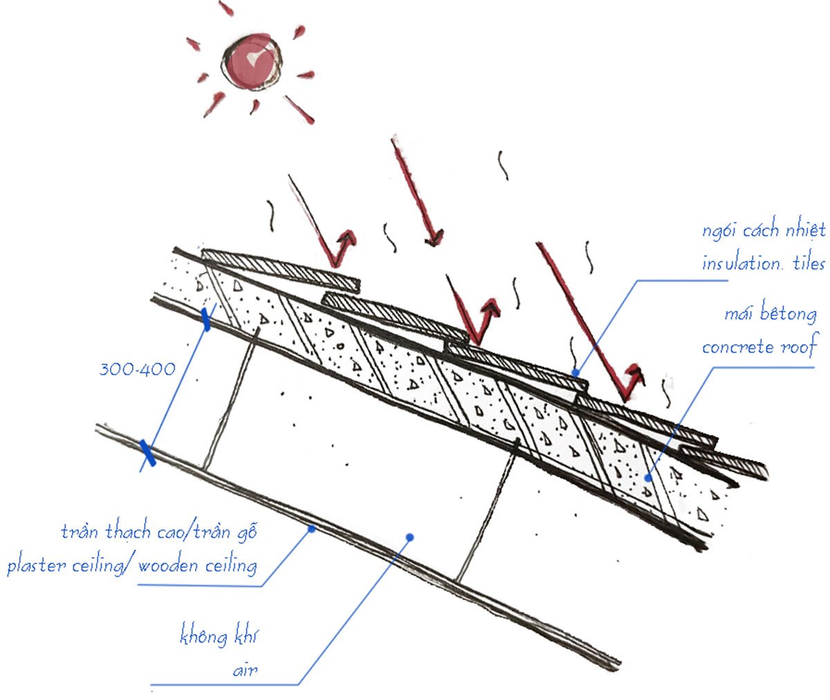 1- The roof system of the house covers the majority of its functional spaces. It features an inflatable structure, creating a layer of insulating air between the roof and the ceiling. Additionally, the top of the roof is layered with heat-resistant tiles, effectively absorbing the intense heat from the sun. To further enhance insulation, the ceiling below is adorned with an additional layer of plaster or wooden panels. This setup effectively blocks out the majority of the heat from the hot summer afternoons of the Southeast region.
