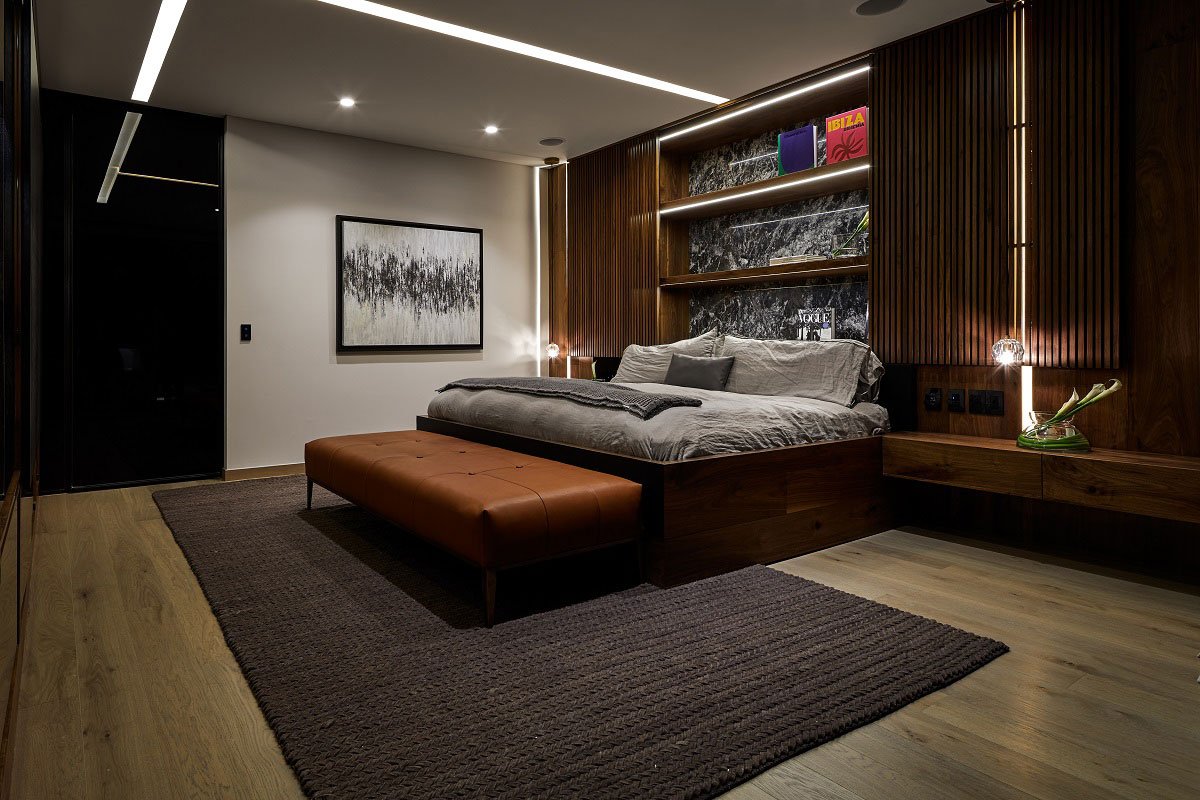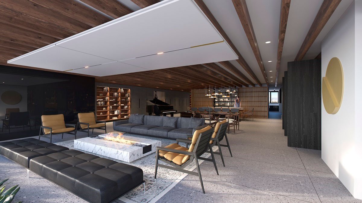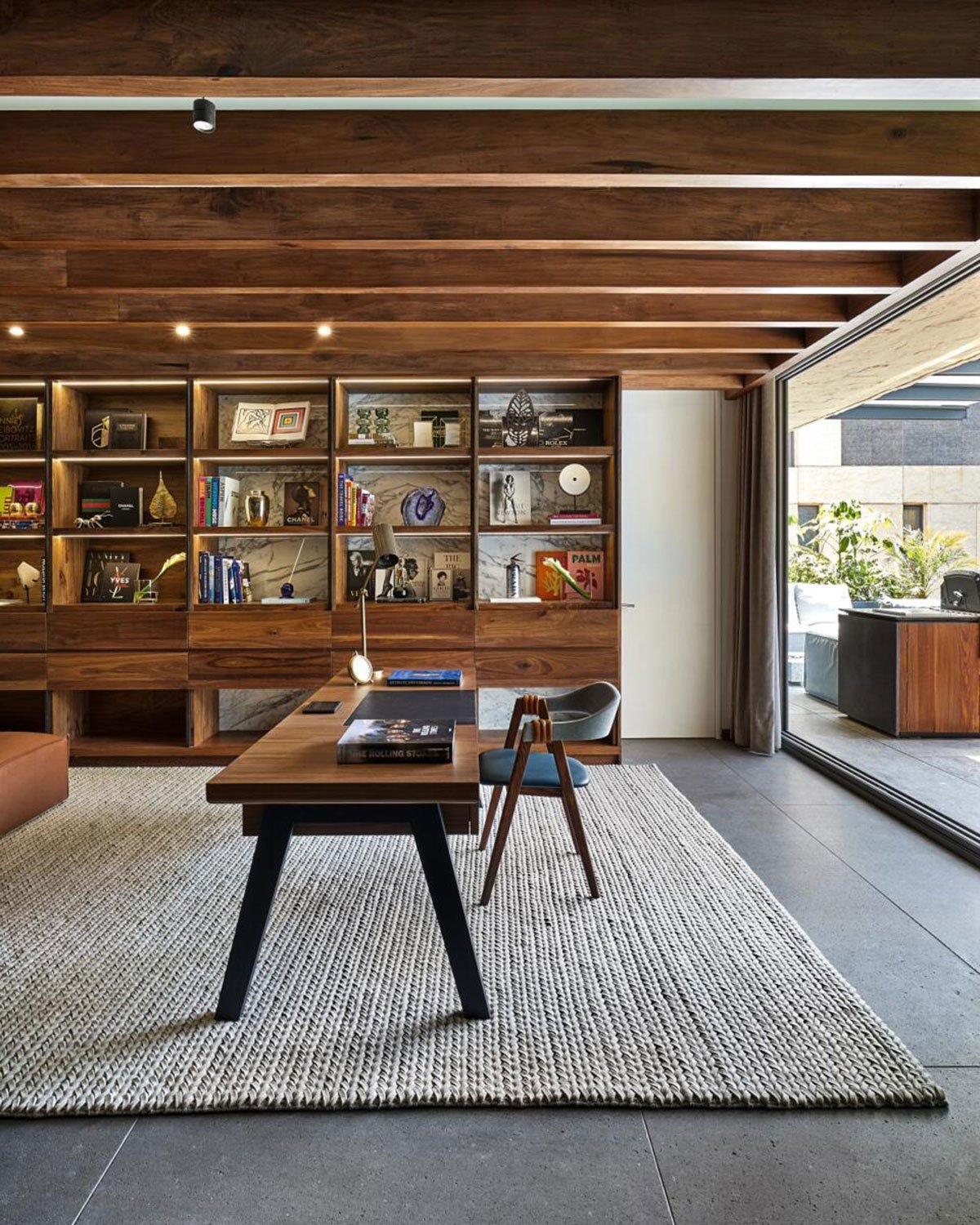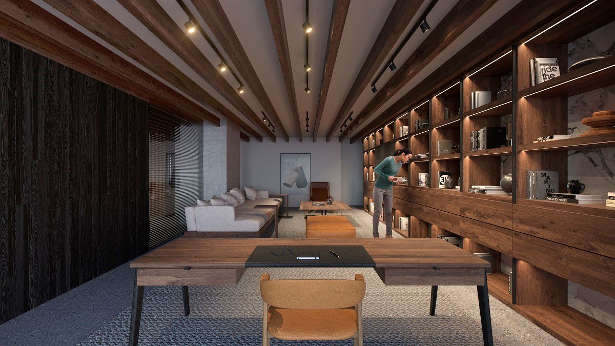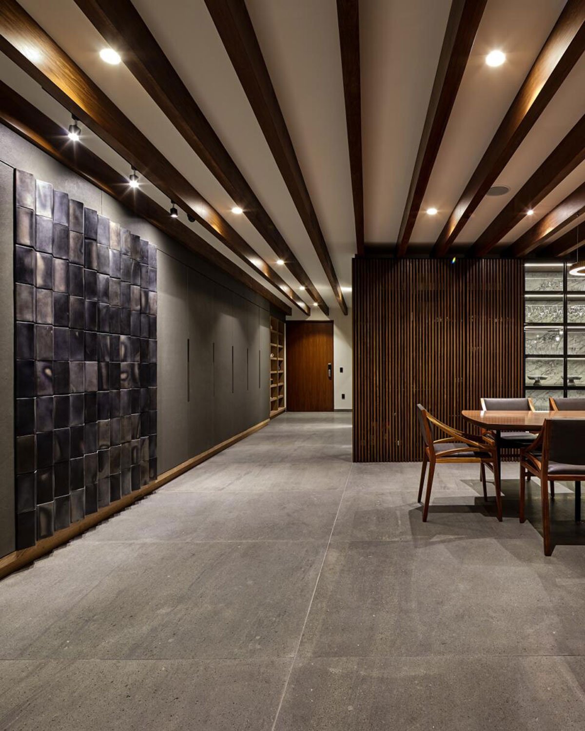 The access introduces us into an elongated vestibule that leads us to the discovery of the spaces; the main area presents us with a dining room for fourteen diners with a design of radial hanging lamps followed by a grand piano that is aligned with a gaming table in the center of the site, and finally there is the living room that leads to a large panoramic window. To add the consistency to the space, natural materials were used, such as walnut wood beams that wrap the spaces into a rhythmic plan and accentuate the atmosphere. Generating a spatial transition with revolving doors that lead us to the family room and study, which houses a floor-to-ceiling bookcase along the side wall.