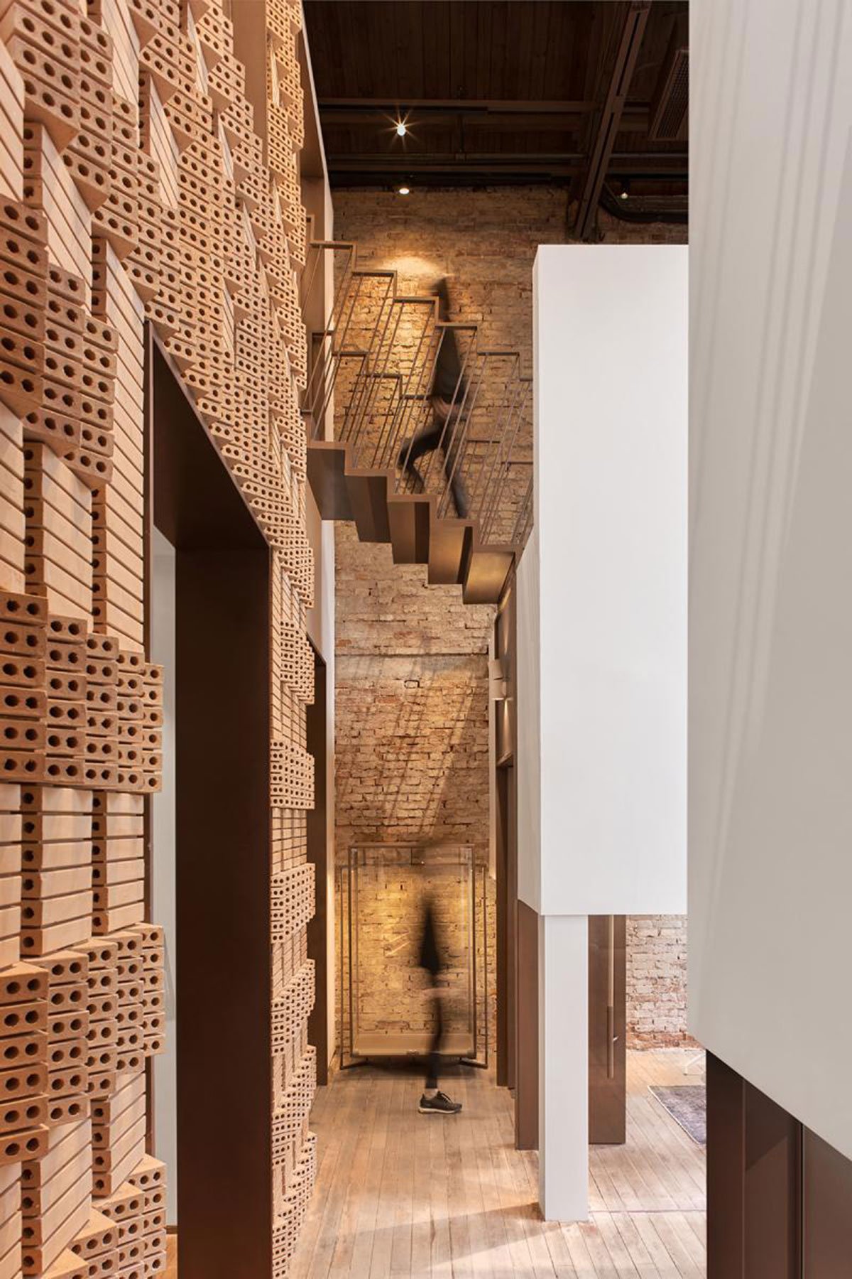 At the entrance, a new full height brick wall stands in contrast with the historical elements, while welcoming visitors. According to the designers, orange bricks were selected to give visitors a warm welcome, much like the brand warms customers with its extreme weather clothing. ‘When we enter into the space,’ the designers explain, ‘We can see this giant orange brick wall, which resembles a chimney. At the other side of this “chimney” is the pantry counter, designed like a log in the heart of a fireplace.’