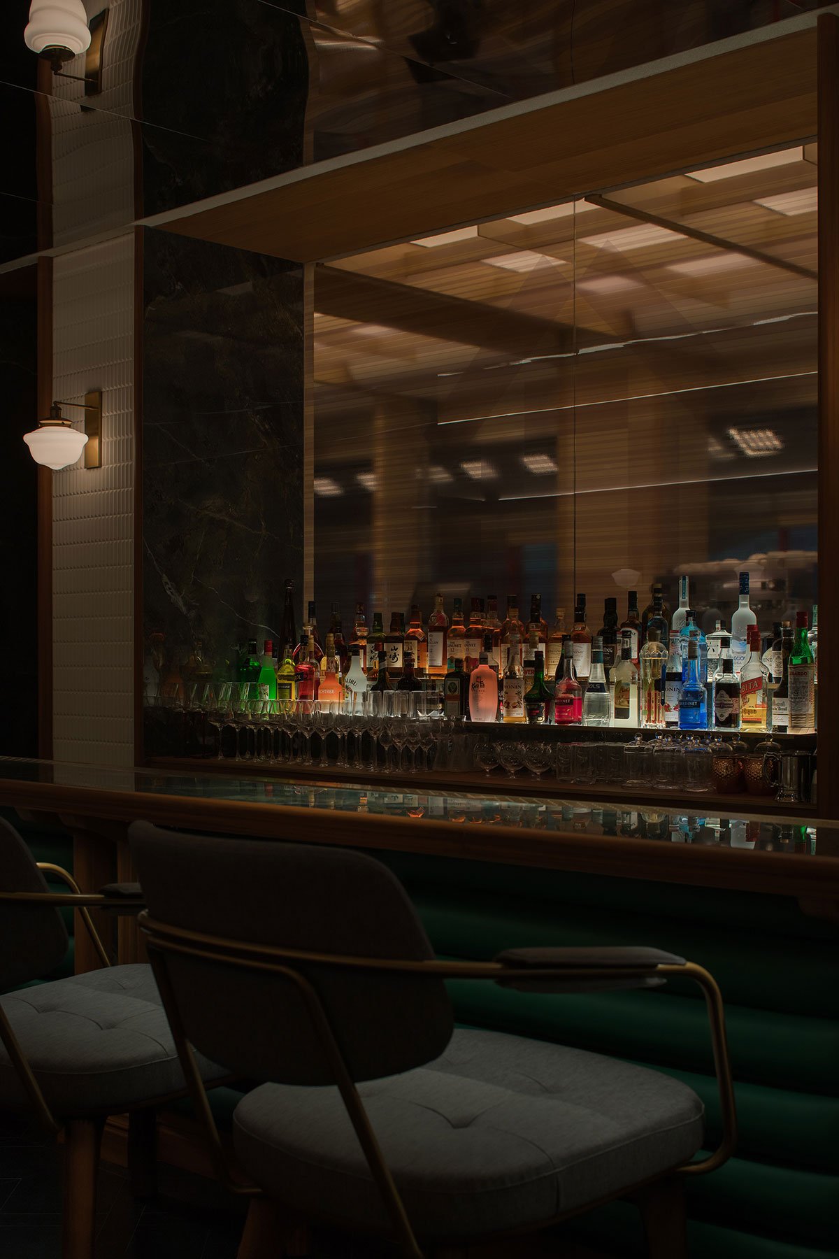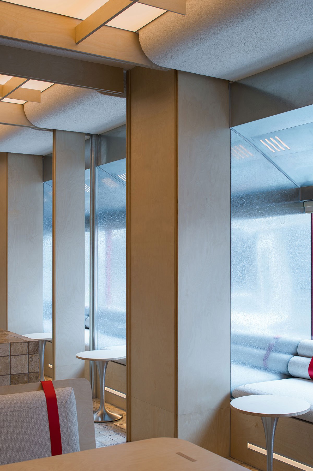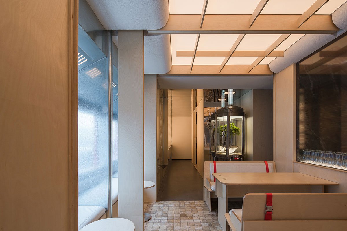 The spatial planning clearly separates the areas of darkness and lightness, catering to the form of a daytime café and a nighttime bar. Visitors can experience the gradual transition of spatial functions within the limited space.