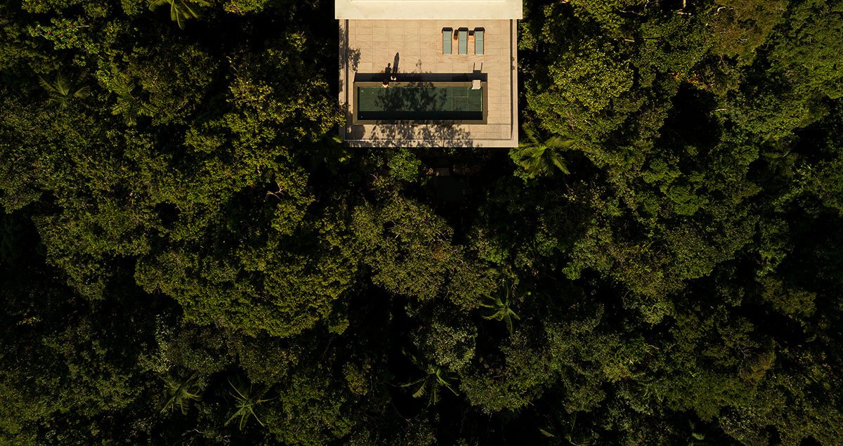 The white prism is suspended by a sequence of stilts, so the house barely touches the ground. The main entrance, accessed by a spiral staircase, connects the terrace to the bedrooms. The strategy leaves no indoor alternative for the connection of spaces; it is a radical experience of the weather, the winds, the smells, and the light of the jungle.