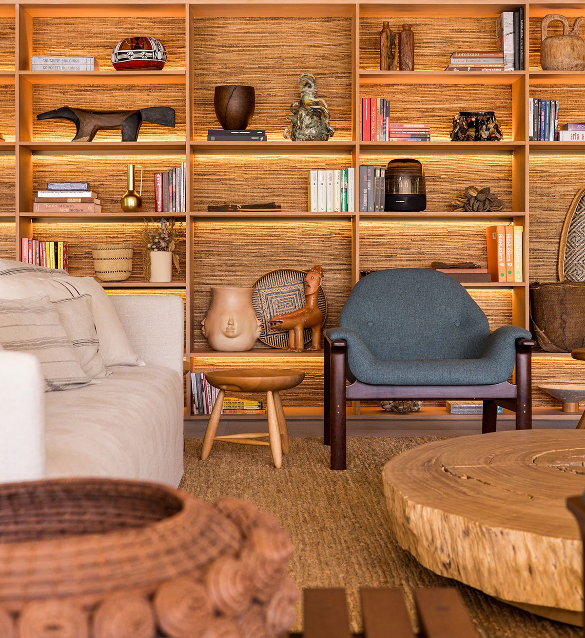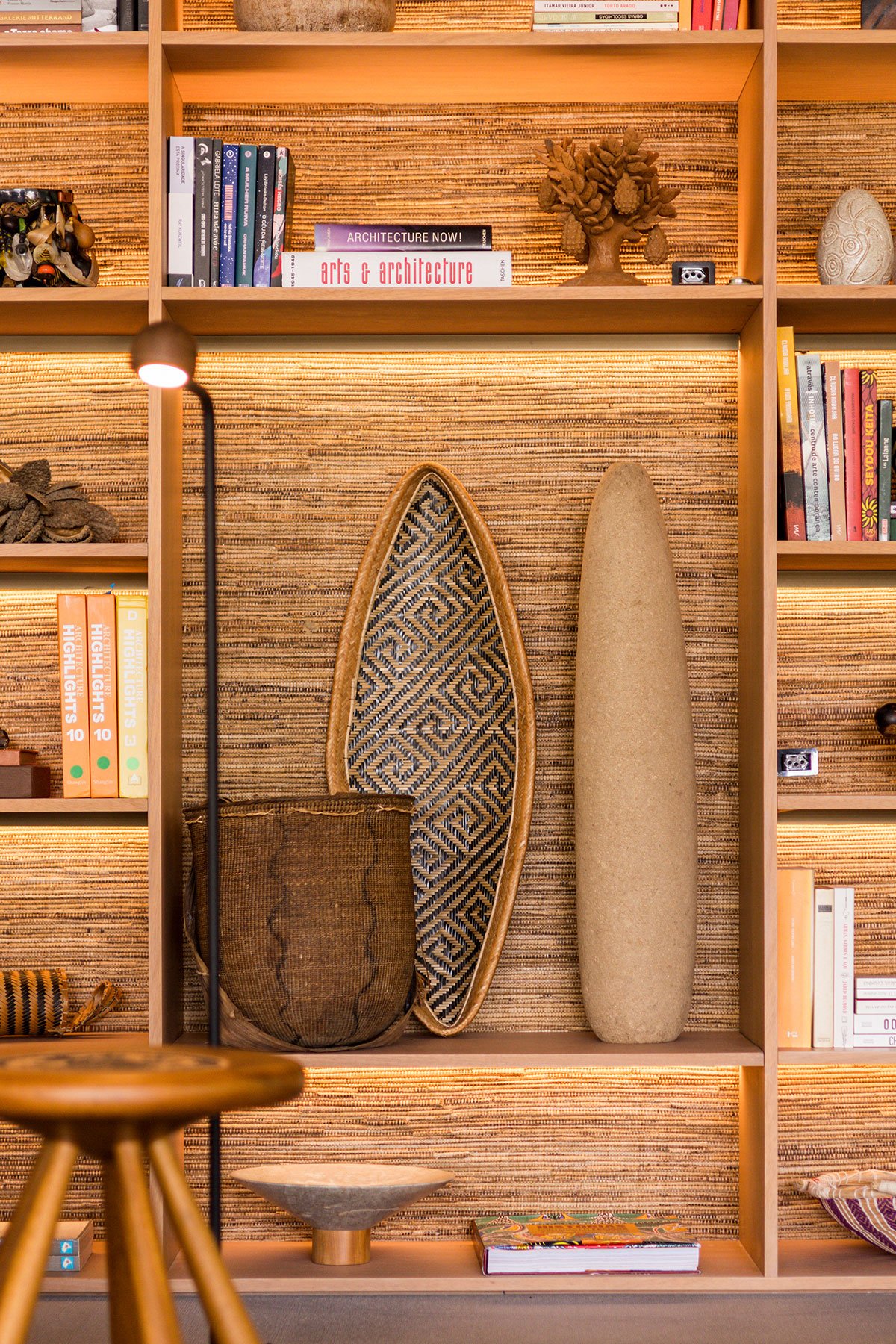 The diversity of fabrics is displayed through a variety of rugs, hammocks, and armchairs, such as Vivi by Sergio Rodrigues. The wood in its versatility appears in the sliding mashrabiyas panels, the coffee table by Pedro Petry, and the sculpture by José Bezerra. Finally, concrete walls perform the allegro finale, tying the whole composition together.