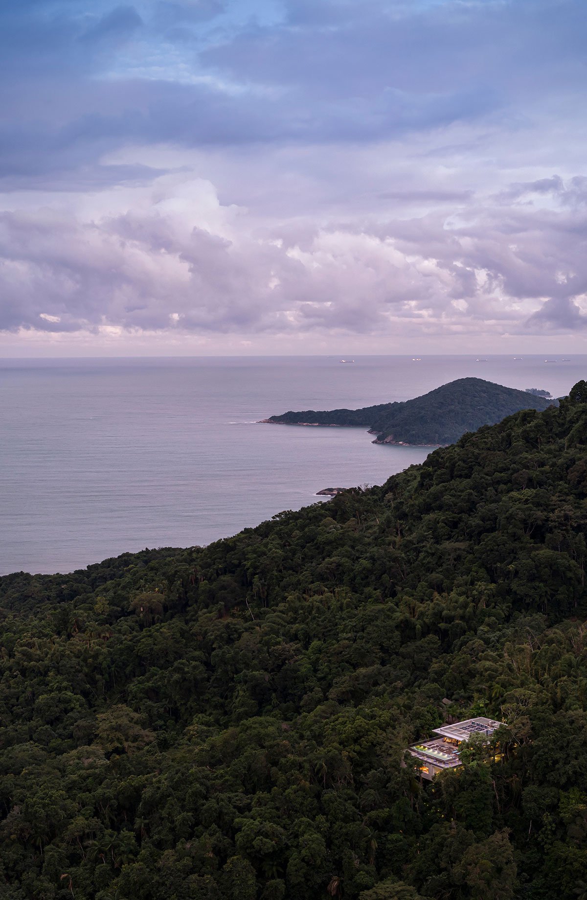 Above the prism, an elevated platform overlooks the canopies. A very light structure, inside the limits of the platform, covers the living area enclosed by sliding glass panels. The transition between inside and outside spaces is extremely subtle, creating a constant and intense feeling of immersion in the Atlantic Forest.