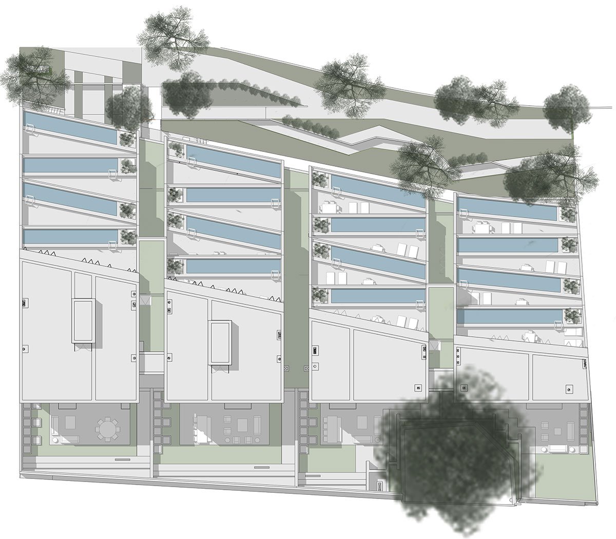 The layout of the rooms in each unit aims to position social areas facing the terrace, blurring the boundaries between external and internal spaces, as desired by the residents.
