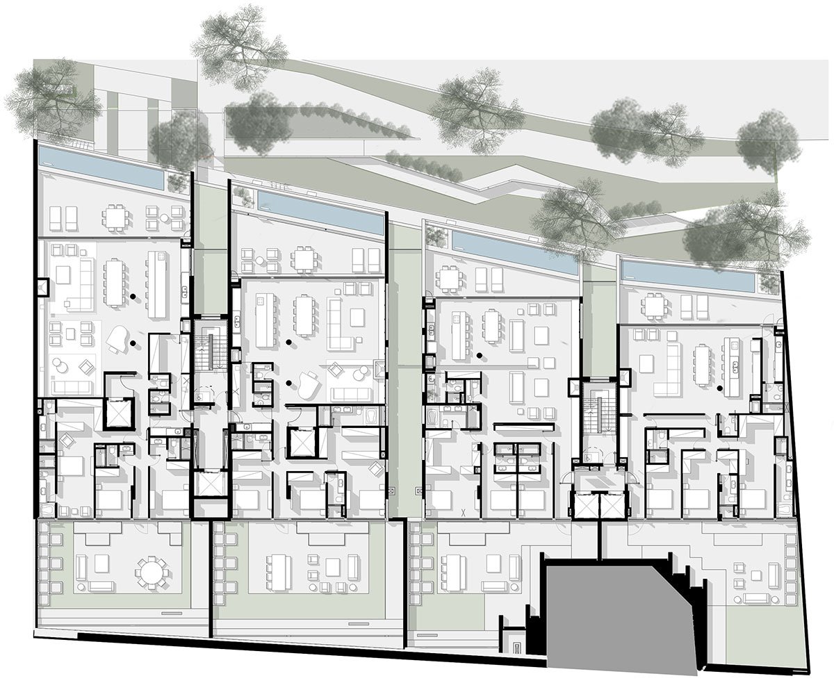 The project’s volumetrics stem from the idea of following the geometric pattern of the surroundings: the four existing lots serve as the foundation for four blocks, each containing four staggered apartments. This staggered arrangement is not merely formalistic: the modification of the original prism reduces the impact of the building on the region, distancing it from the public road on each floor. Additionally, it follows the original topography of the land and creates private terraces with linear pools. Between the floors, the apartment’s front is either parallel to the street in front or perpendicular to the side boundary, creating dynamism for the volumes.