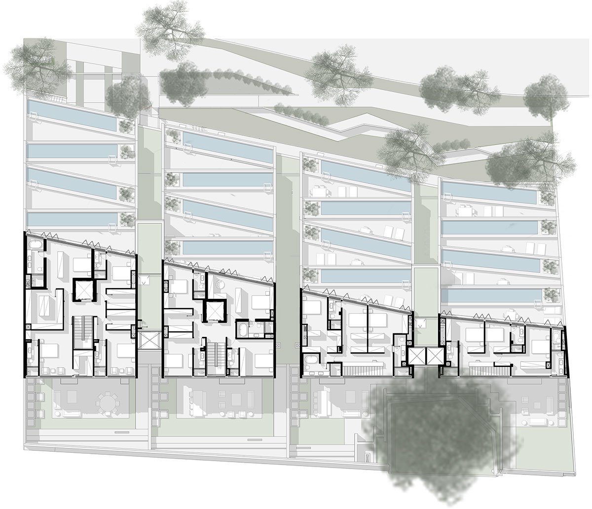 The terraces play a crucial role in the project. According to local regulations, they are not counted as built-up areas, which increases the potential private area for sale. To enhance privacy between units and reinforce the concept of suspended houses, each apartment features a “U”-shaped concrete tray, crowned in front by a pool covered in Hijau stone.