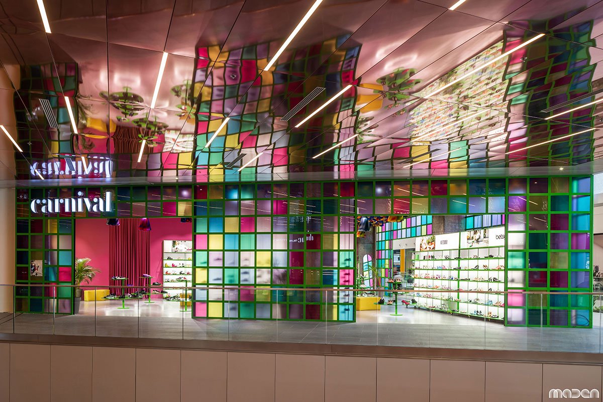 A variety of colors was used in order to guide the customer inside the store starting with the stained glass panels in the storefront, the same as happens in carnivals where different colors make the environment attractive.