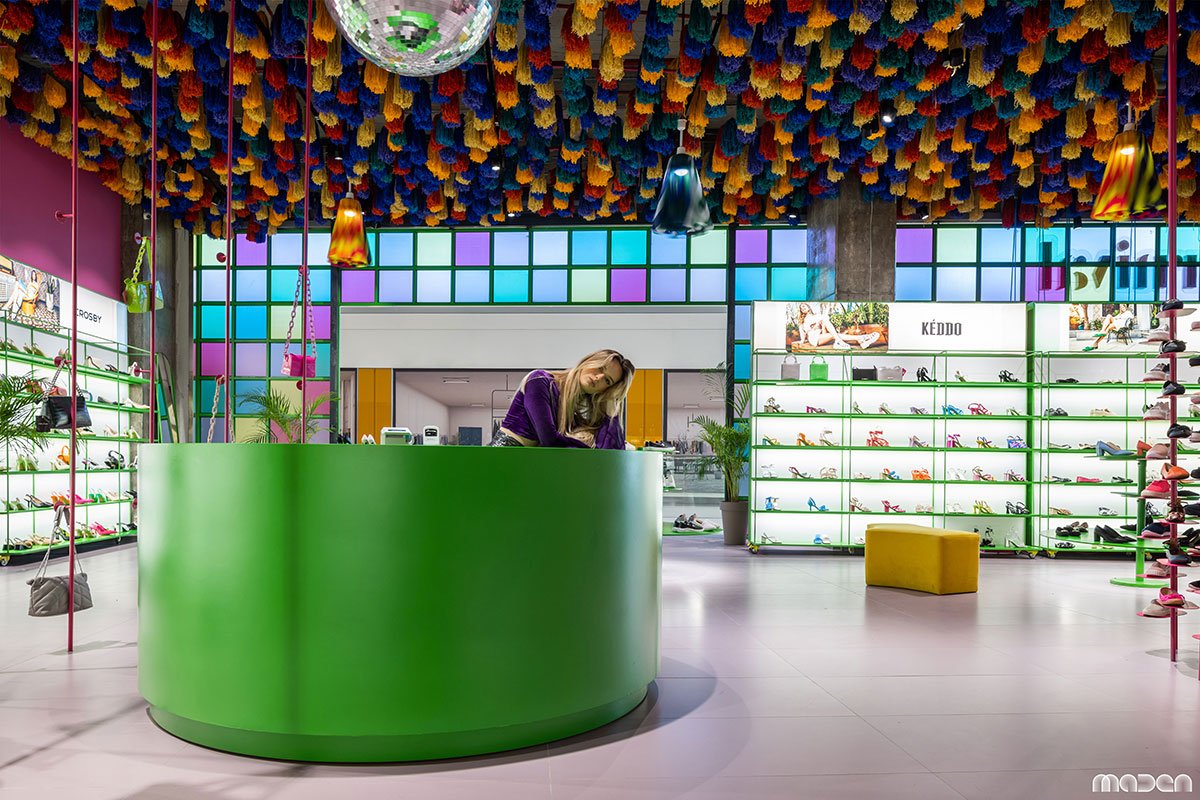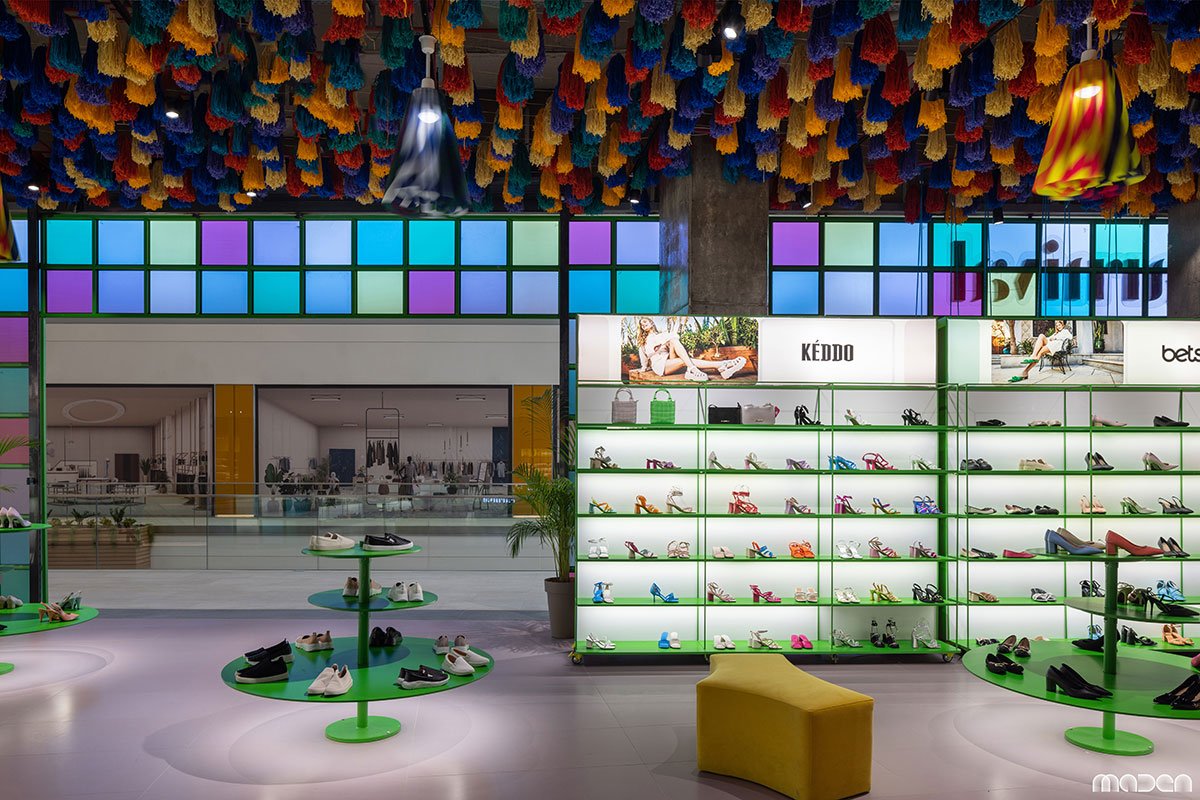 Excerpt: Carnival – Prishtina Mall designed by Maden Group takes inspiration from the carnivals that take place outdoors and tries to bring the external elements inside to resemble the feeling of being at a carnival. Gira-gira is a rotating platform located on the playground on which children sit and play. Gira-giras were used as central elements on which the shoes could be exposed, while scaffolding was used as the cashier stand.