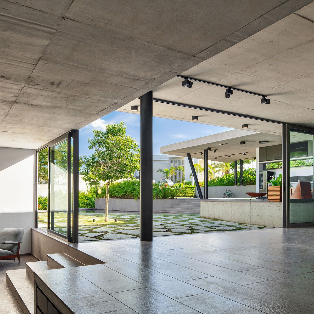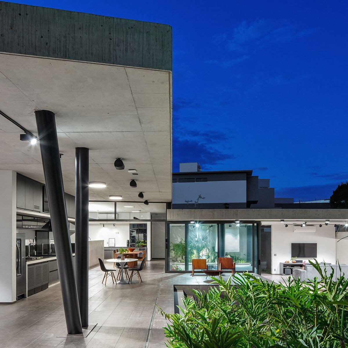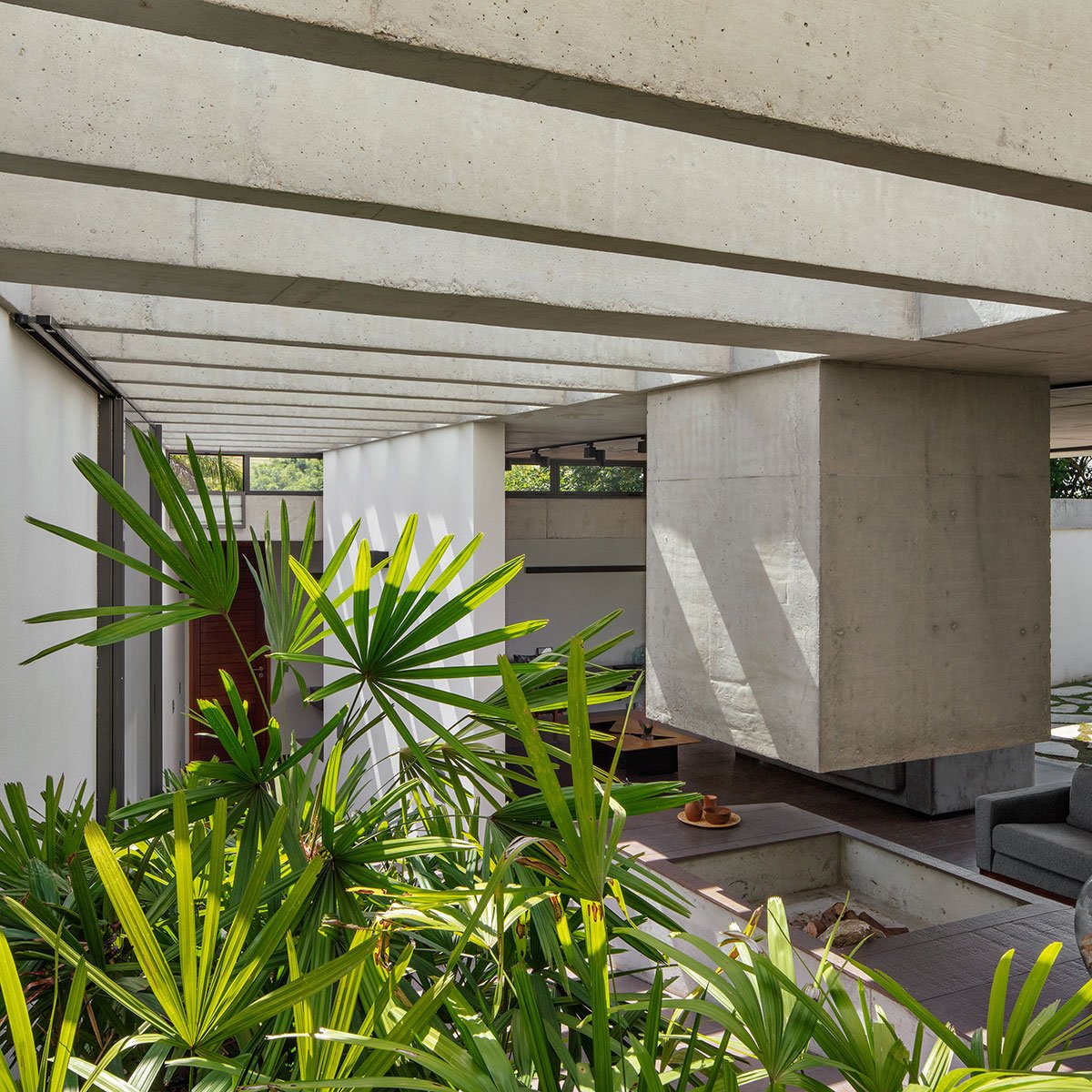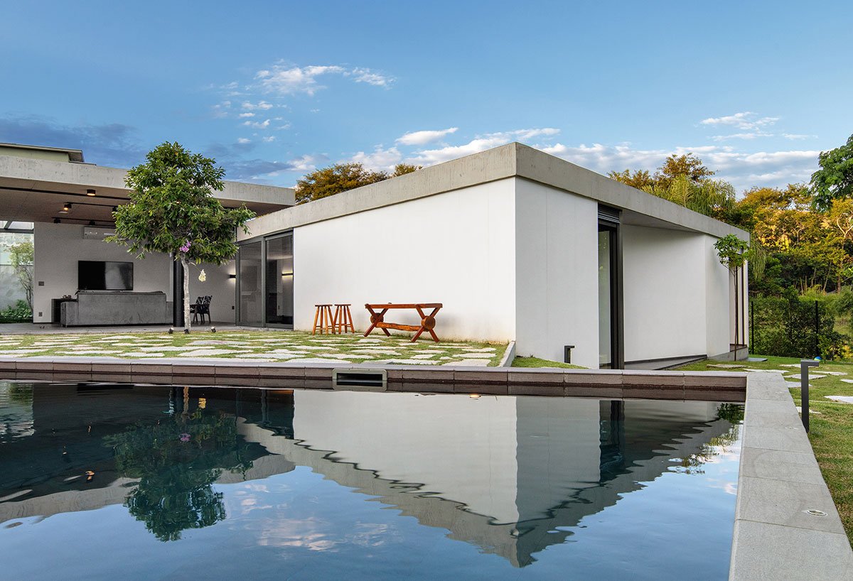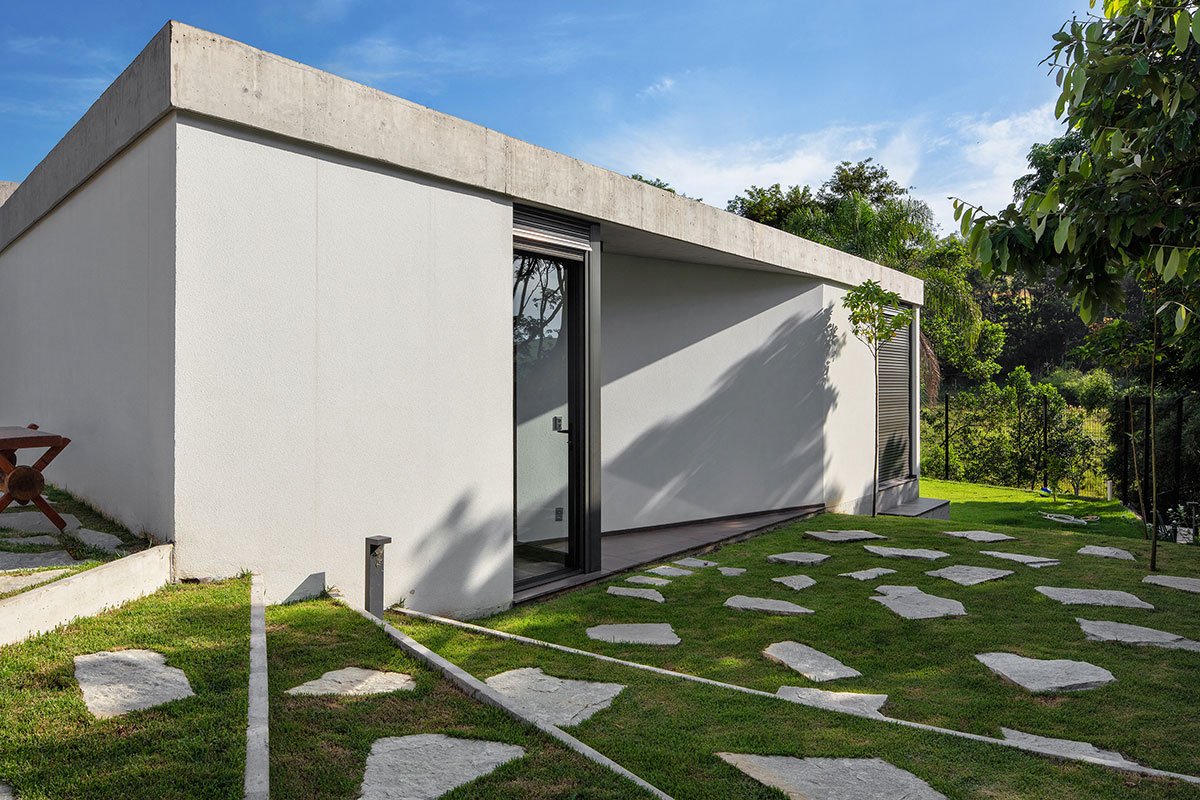 Excerpt: Obra Arquitetos designed a U-shaped residence characterised by a concrete enclosure surrounded by a combination of softscape and hardscape environments which allow people to meet and socialize freely.