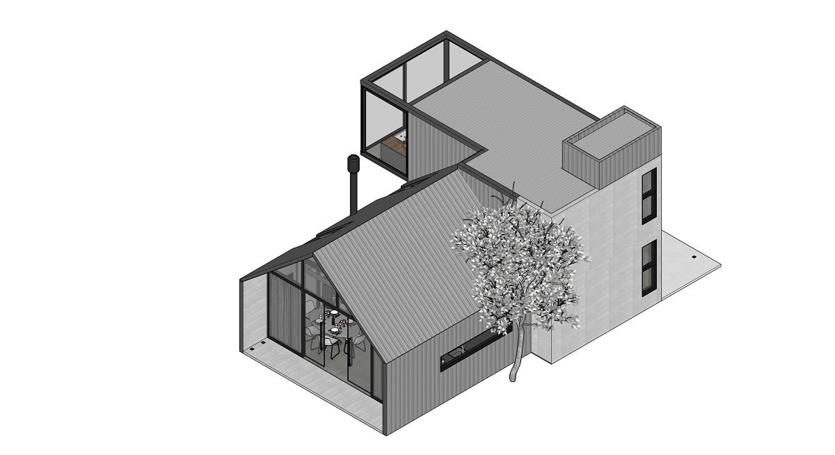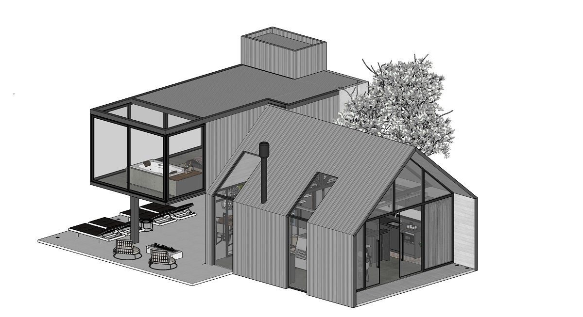 The strategy applied to bring the visitor even closer to this natural environment is embodied by the suspended volume at the back, which houses the room with a whirlpool bath. The building has a panoramic view that frames the sunrise and sunset. The total area, considering the double height, is 86,75 interior square meters.