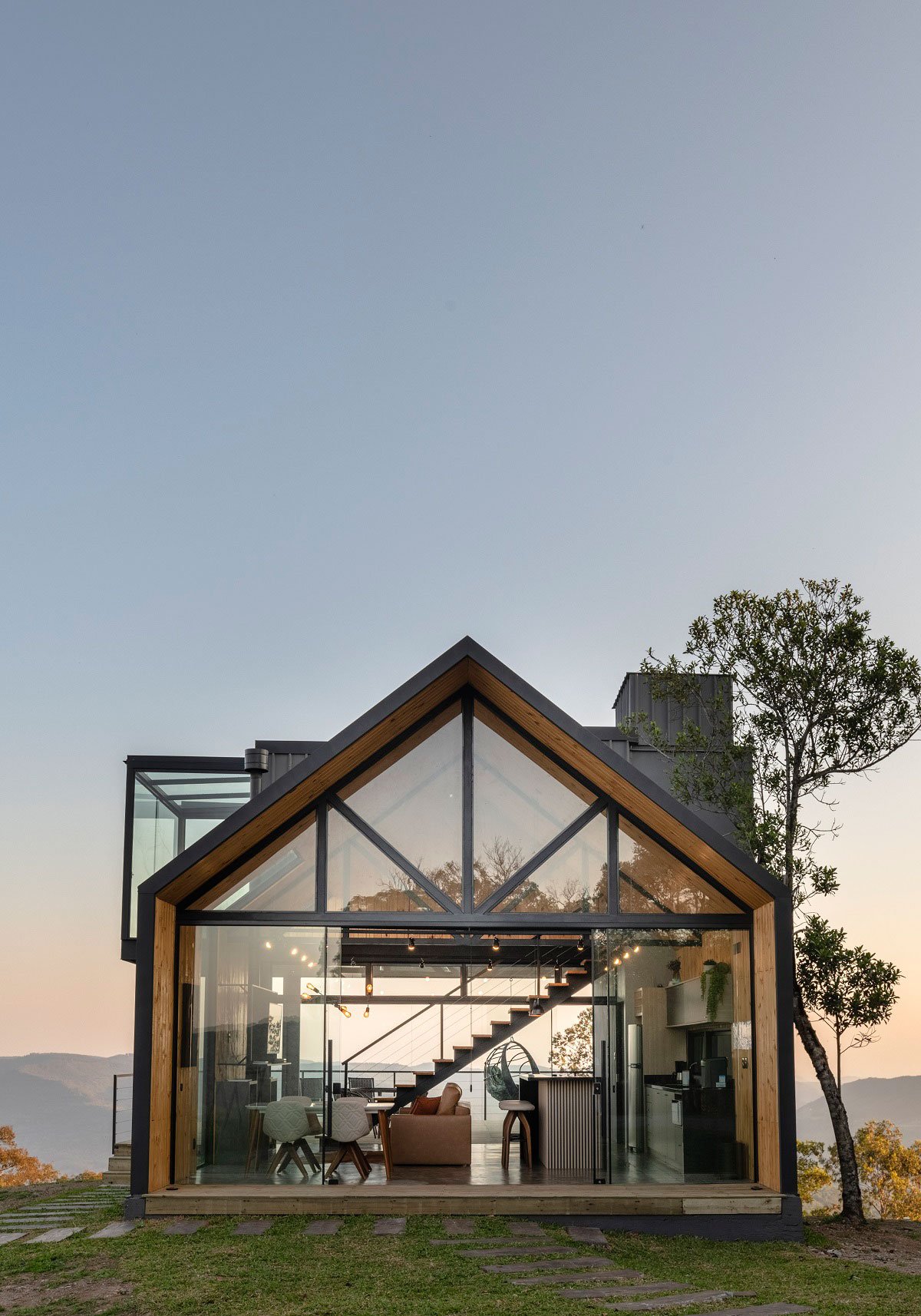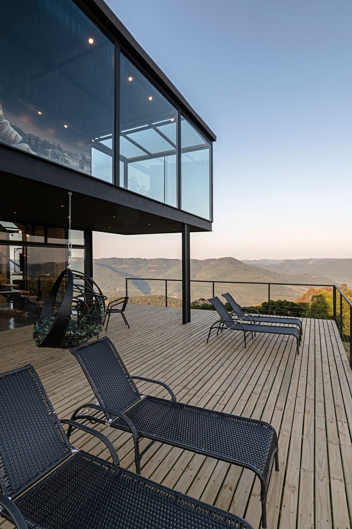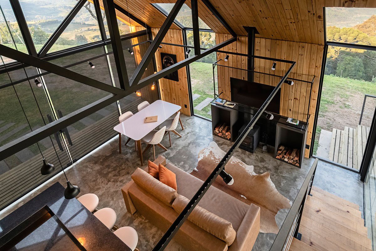 Constructive technologies help to realize the dream of a country house with a few advantages. Shorter execution time and mobility of materials in steeper topographies are some of the advantages of the steel frame to develop this charming contemporary cabin. Project for rent, Casa Asolo is part of the Villa Montegrappa accommodation complex, in Caxias do Sul/RS. With large glass panes, natural wood coatings and exposed concrete, the construction is entirely focused on the stunning landscape of Cerro da Glória.