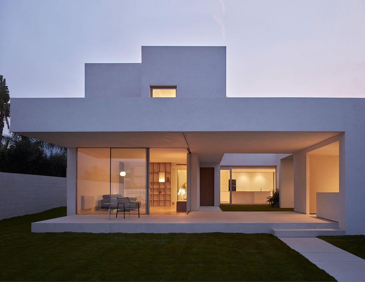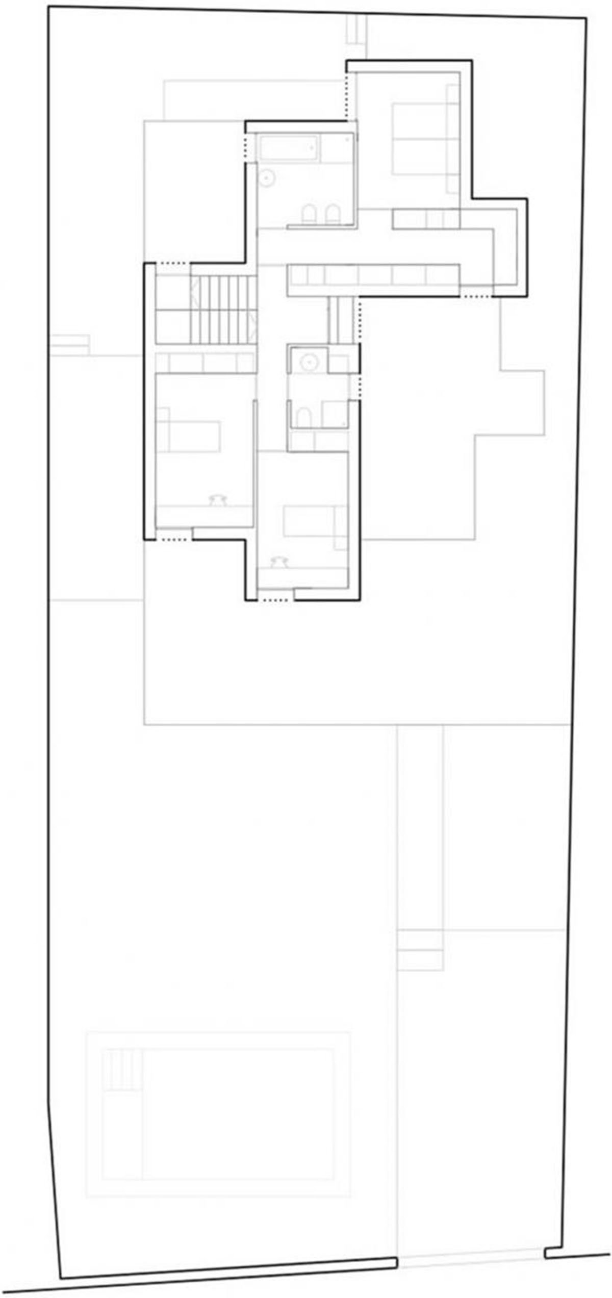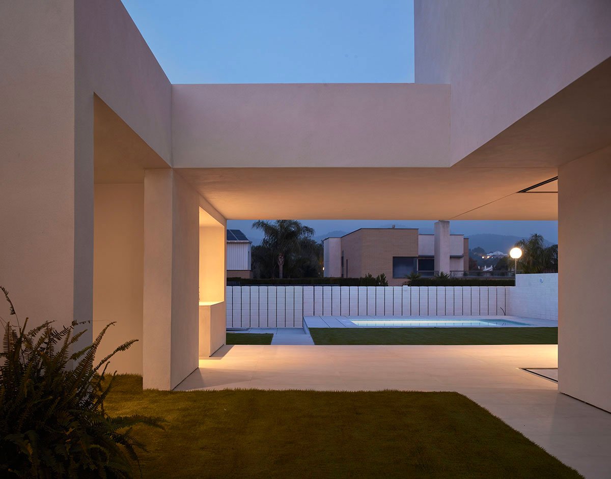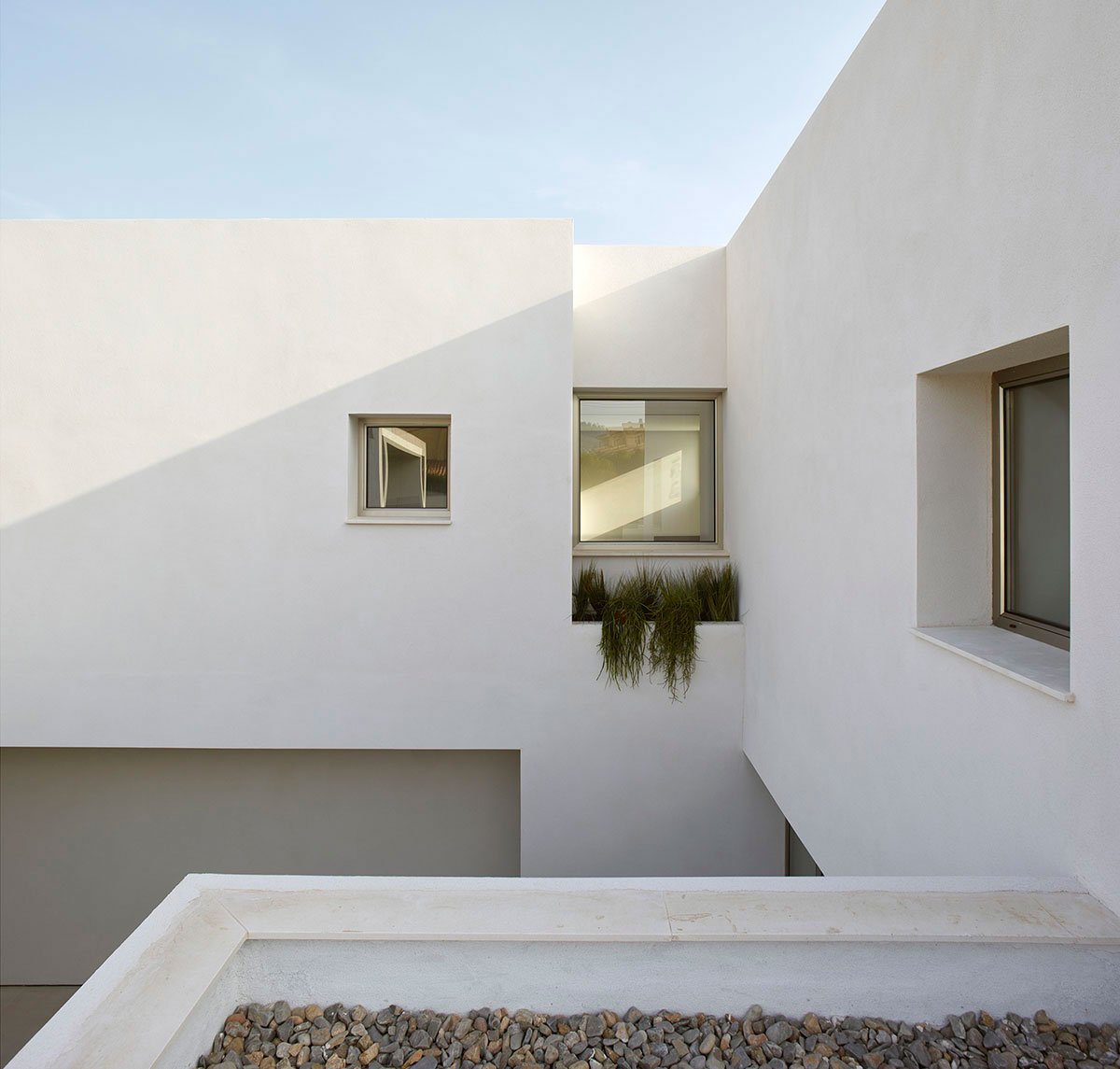 Its footprint on the ground floor is deformed to embrace a patio that gives meaning to each of its rooms. This patio serves as the center and articulator of the activity on the ground floor, in which the day area is located. Besides, it allows to maximize its facade length to extend its relationship with the outside, undoing the traditional limits and thus establishing a new link with it. The successive transitions between interior and exterior allow a fluid movement around the plot and an attractive relationship between the void and the sculpted body, which reduces the scale of the exterior and interior spaces of the house.