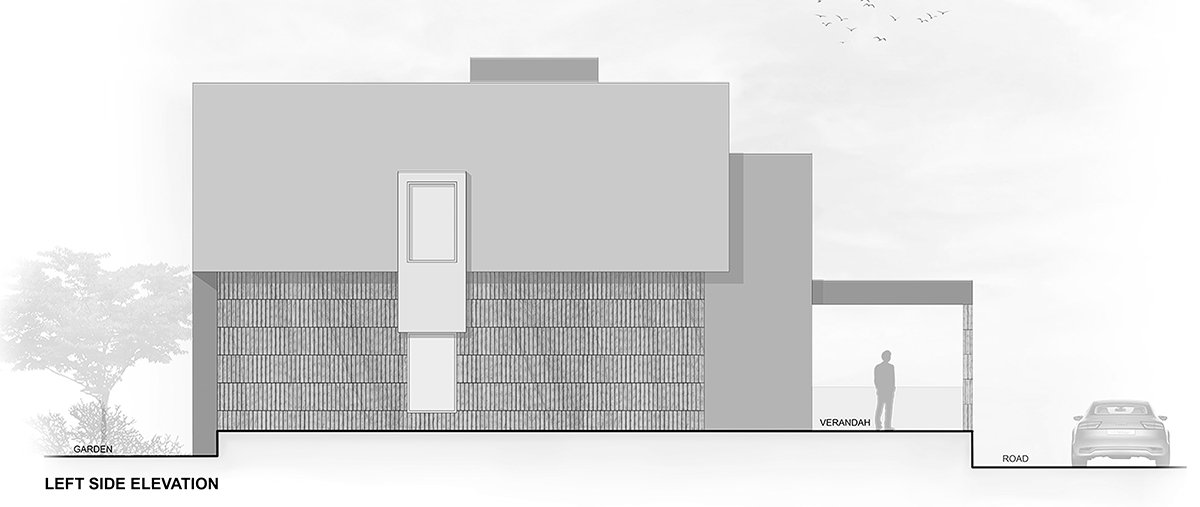 The house is on a corner plot and sits alongside the internal road of a gated community, overlooking the landscape. The land was surrounded by existing mature trees on the periphery, which were left untouched. The built volume and the layout design is ruled by the sun path integrating and allowing the free flow of natural light and air. This intuitive interaction with the forces of nature creates a dynamism that lends itself to the indoor-outdoor dialogue that is at the heart of the architecture.