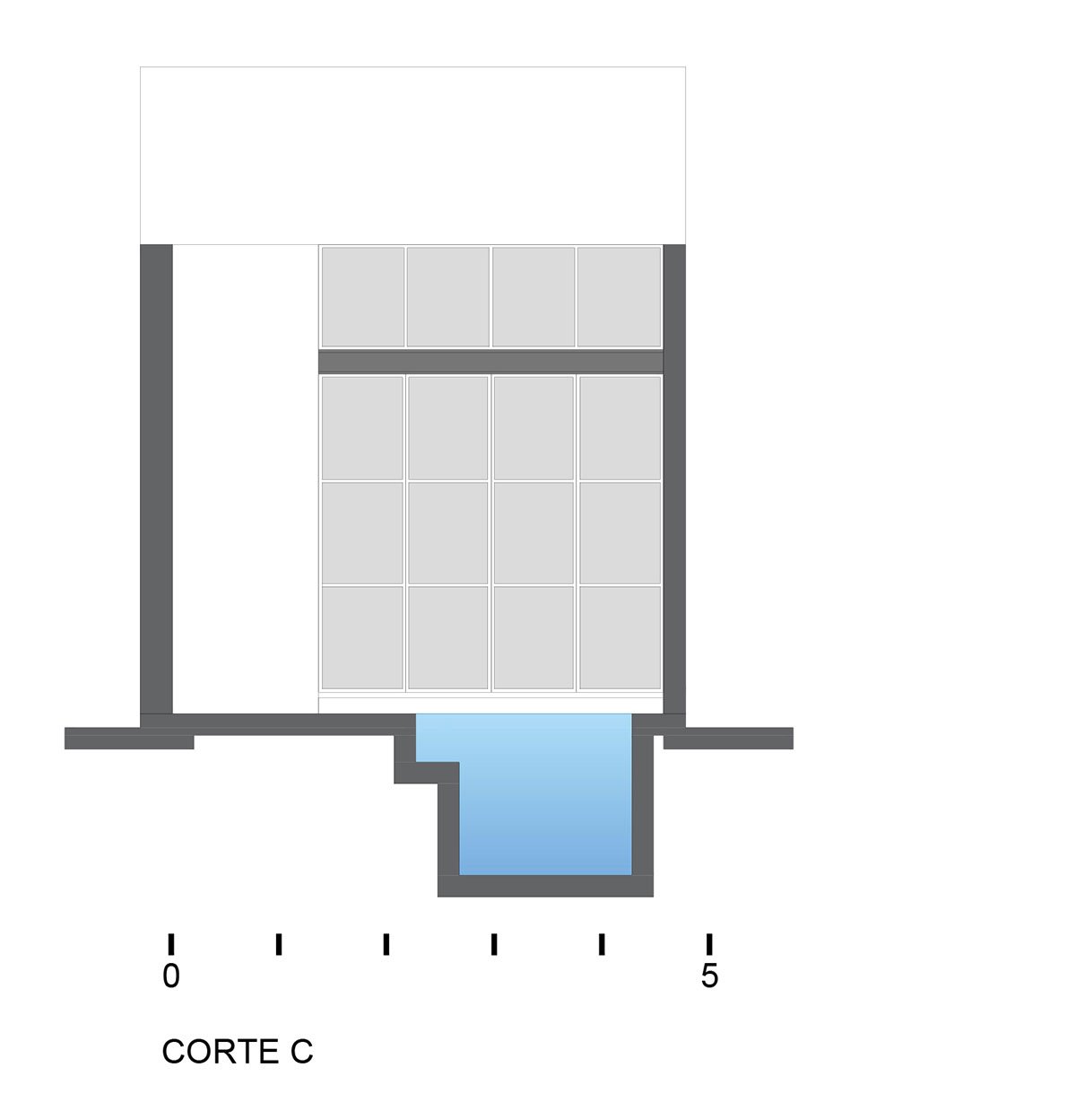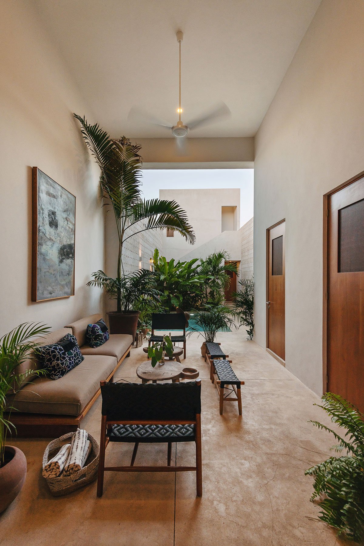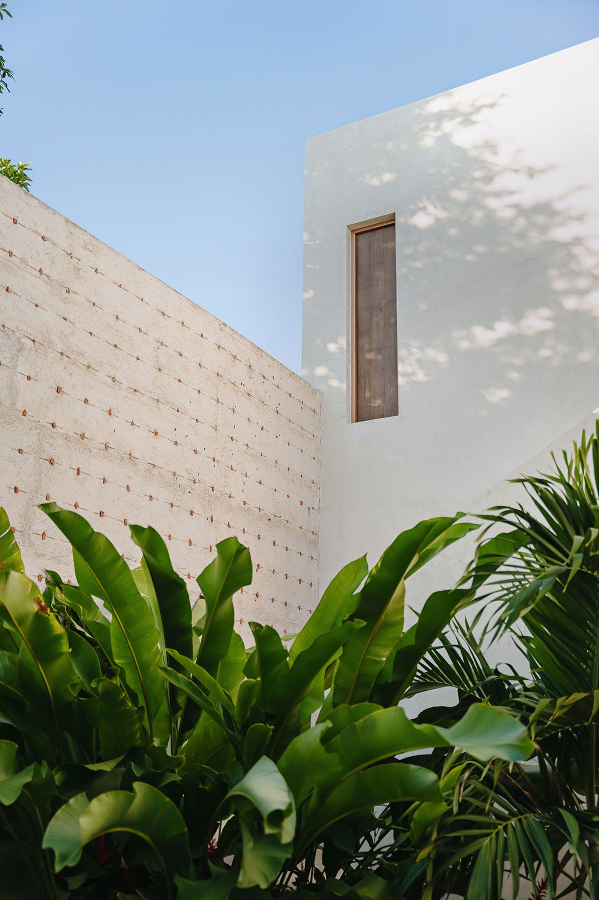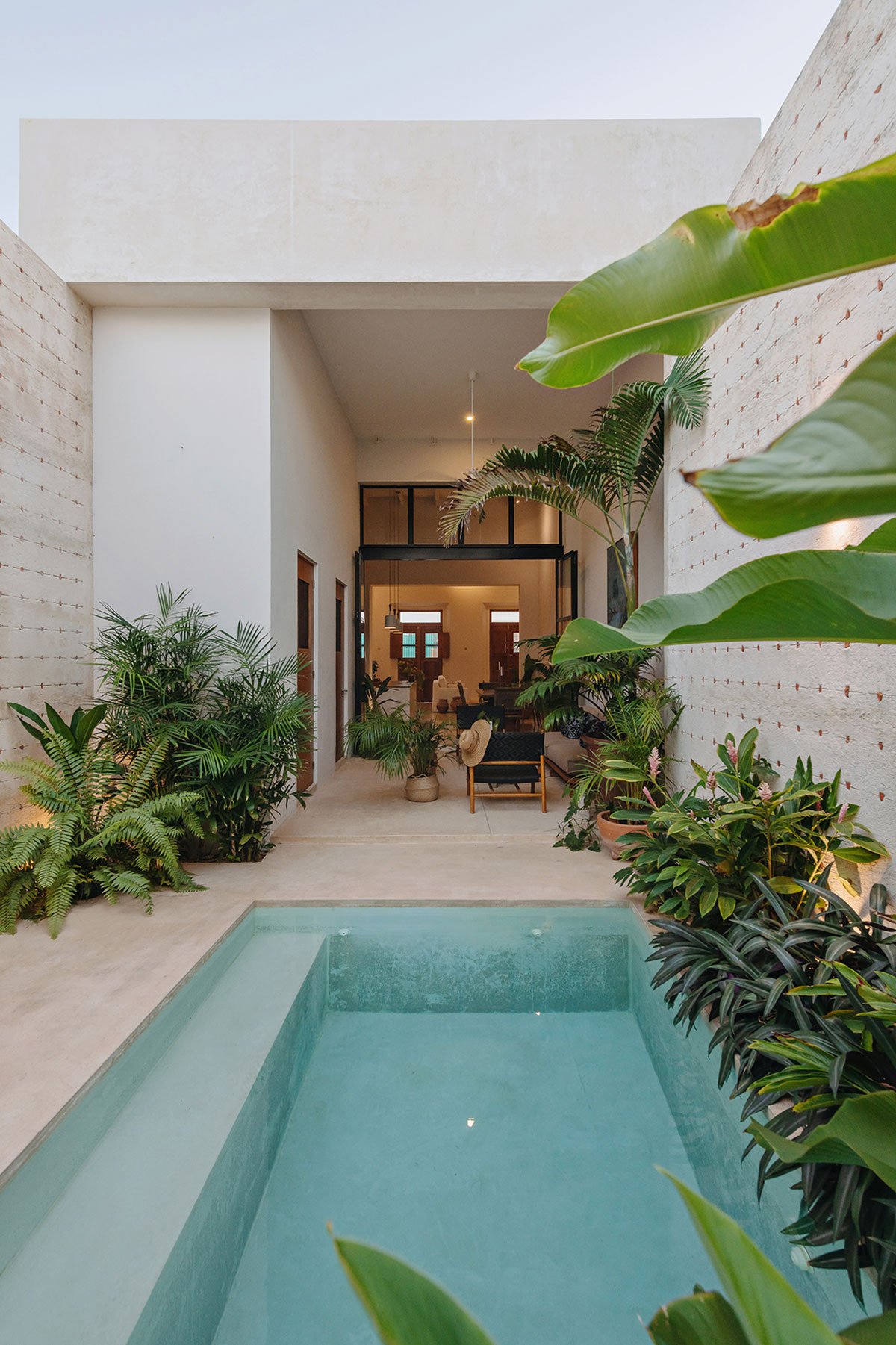 The small central patio has a chukum pool located between two high concrete walls with a clay tile texture detail, creating a beautiful contrast with the green colors of the vegetation.