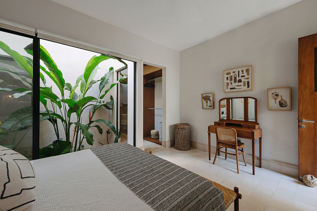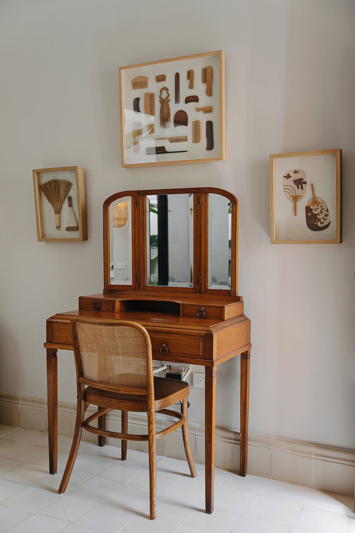Two hanging bejuco lamps flank the bed, creating a romantic play of light and shadow that permeates the surfaces of the bedroom. On the opposite wall, a collection of handmade combs, mainly from Oaxaca, rest right above an old wooden dressing table.