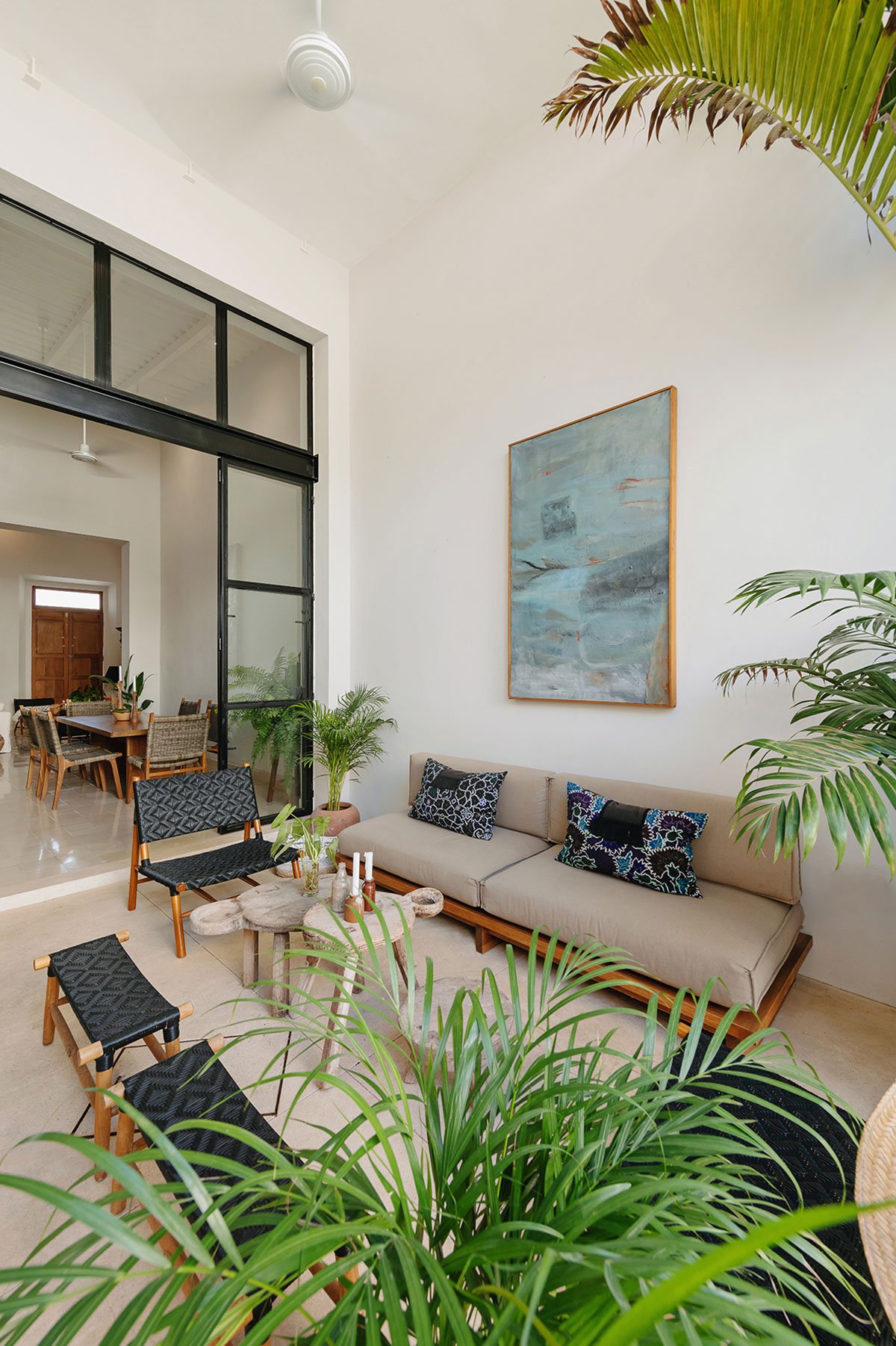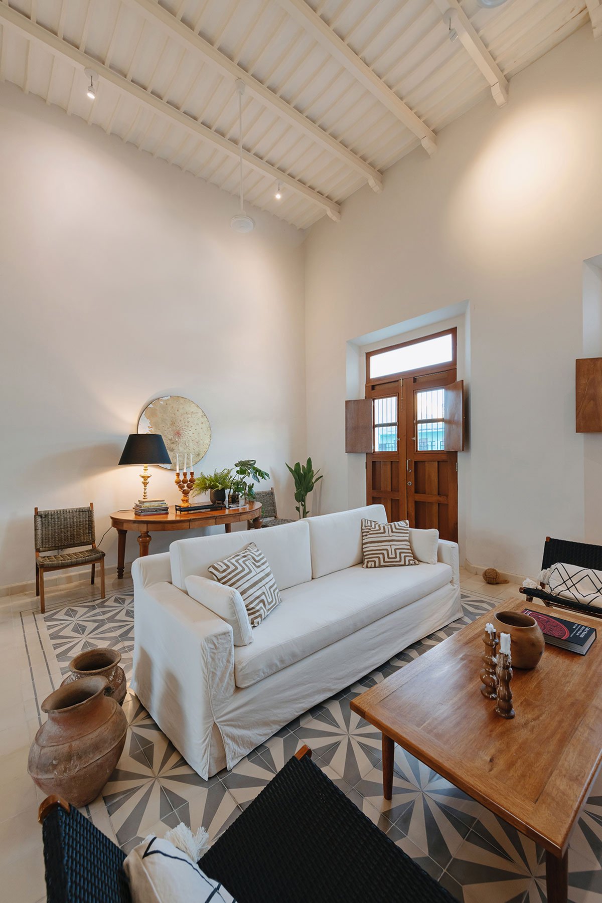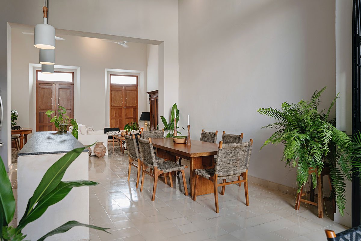 With the exception of the eclectic style façade in pastel blue, the color palette used in the rest of the house is neutral and raw tones as in the pasta tile floors, the walls, the beams and the white cement and chukum exteriors. It was intended to create a fresh and tropical space throughout the house by the use of vegetation, and wooden furniture in natural tones, where art and handcrafts would play a leading role in the space.