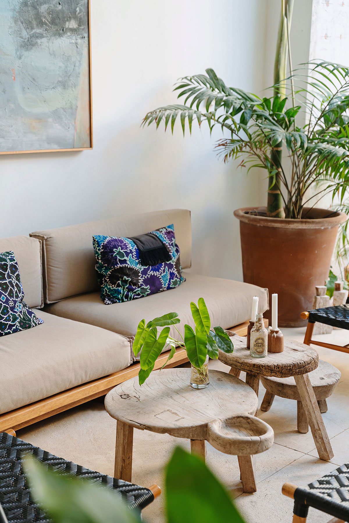 Two old wooden banquetas, formerly used to knead dough to make tortillas, serve as the center tables of the outdoor living area and were obtained from a local antique store. On the neutral colored sofa, two cushions made of huipiles from Zinacantán, Chiapas stand out for their colors and patterns.