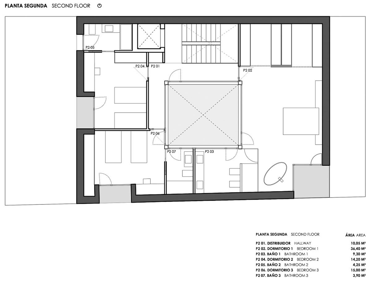 The everyday functions and uses of the house are carried out in the day area on the first floor, and the second floor is dedicated to night use. Both levels have exterior views through large cut-out spaces in the concrete prism, and both open up to a large central interior courtyard. This predominant area creates a high-quality of living with its optimum natural illumination and cross ventilation in all interior spaces.