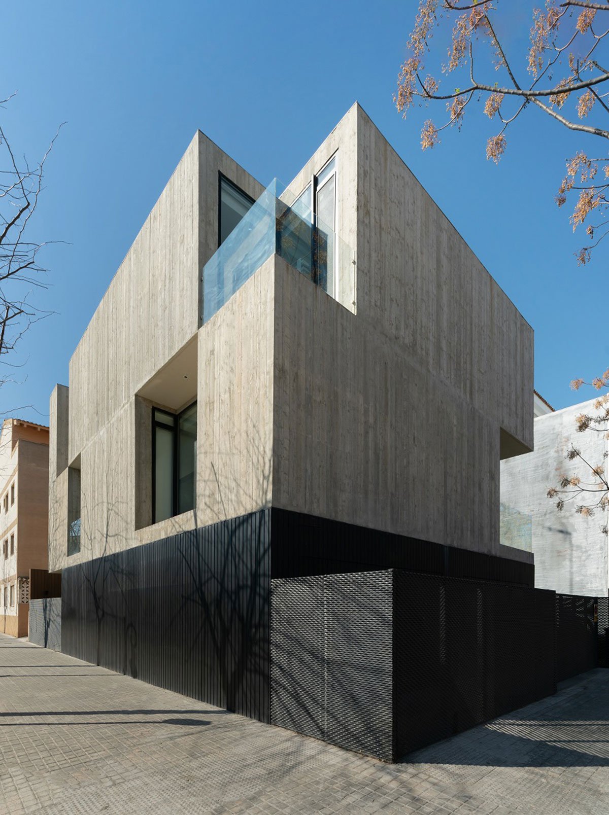 The ground floor corresponds to the public and leisure use of the building (as well as the parking area). It is completely concealed from the street view and opens up to the interior courtyards. While granting complete privacy in an urban setting, this style of construction also connects the outside and inside areas by means of large windows defining the ground floor porch.