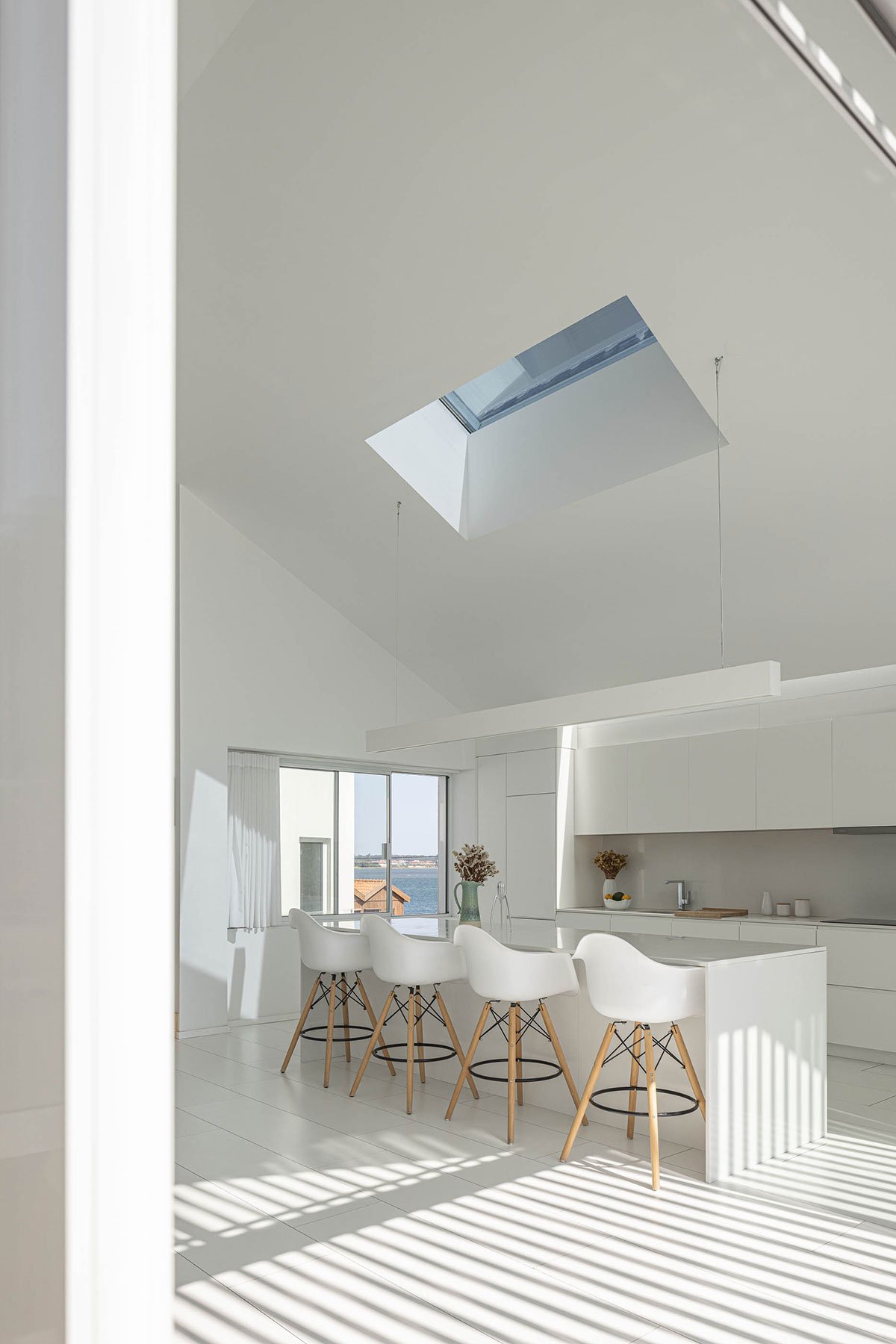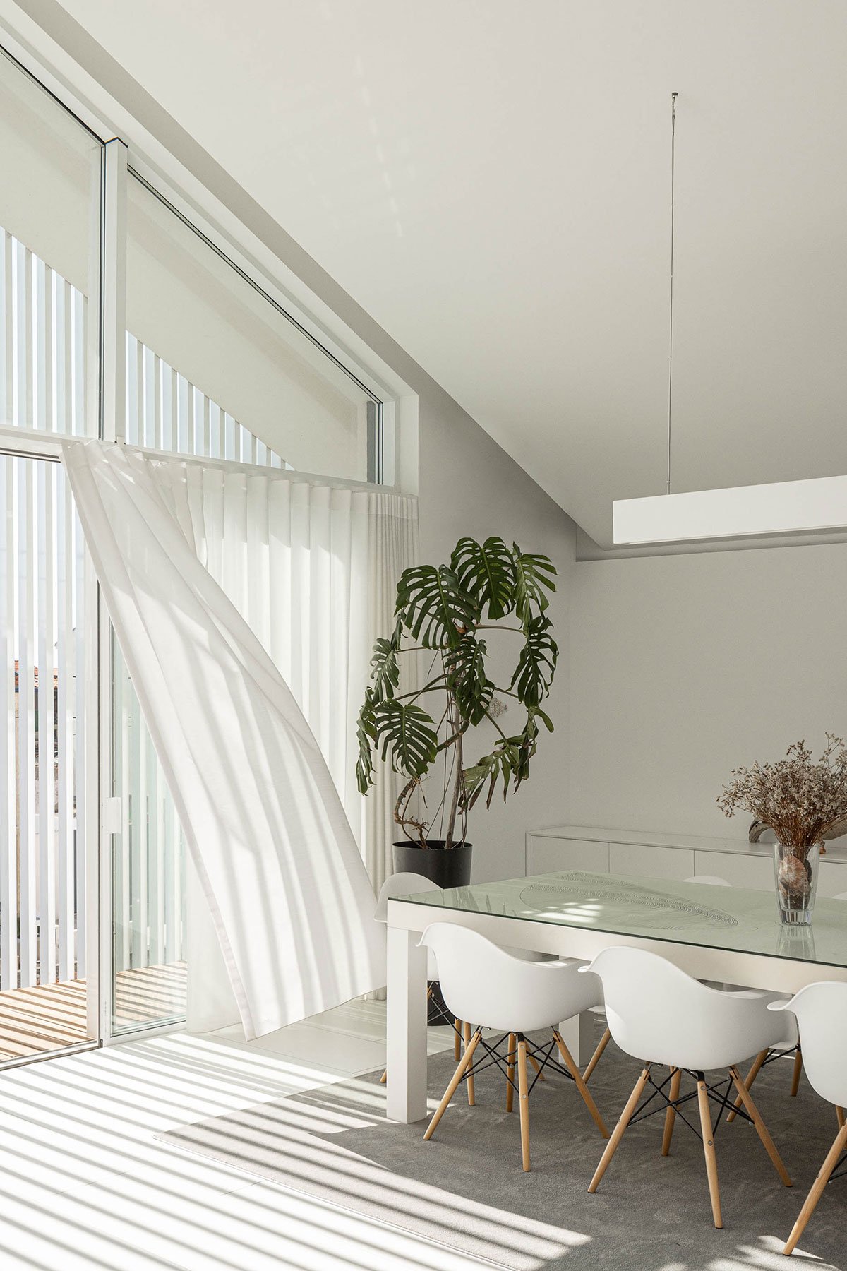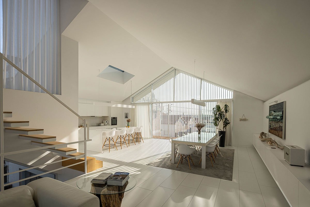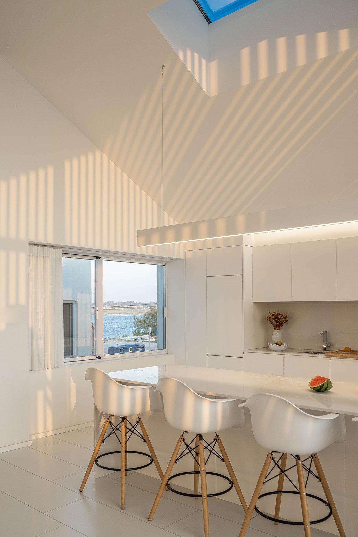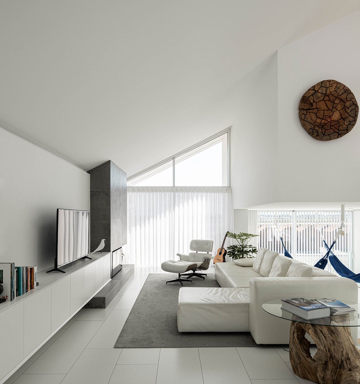 The social area was located on the upper floor, an area that was wide and with a very generous ceiling height, looking out over the estuary. Space to receive family and friends on festive days, articulated with the terrace on the roof, the lighthouse of the house, where the users can enjoy more.