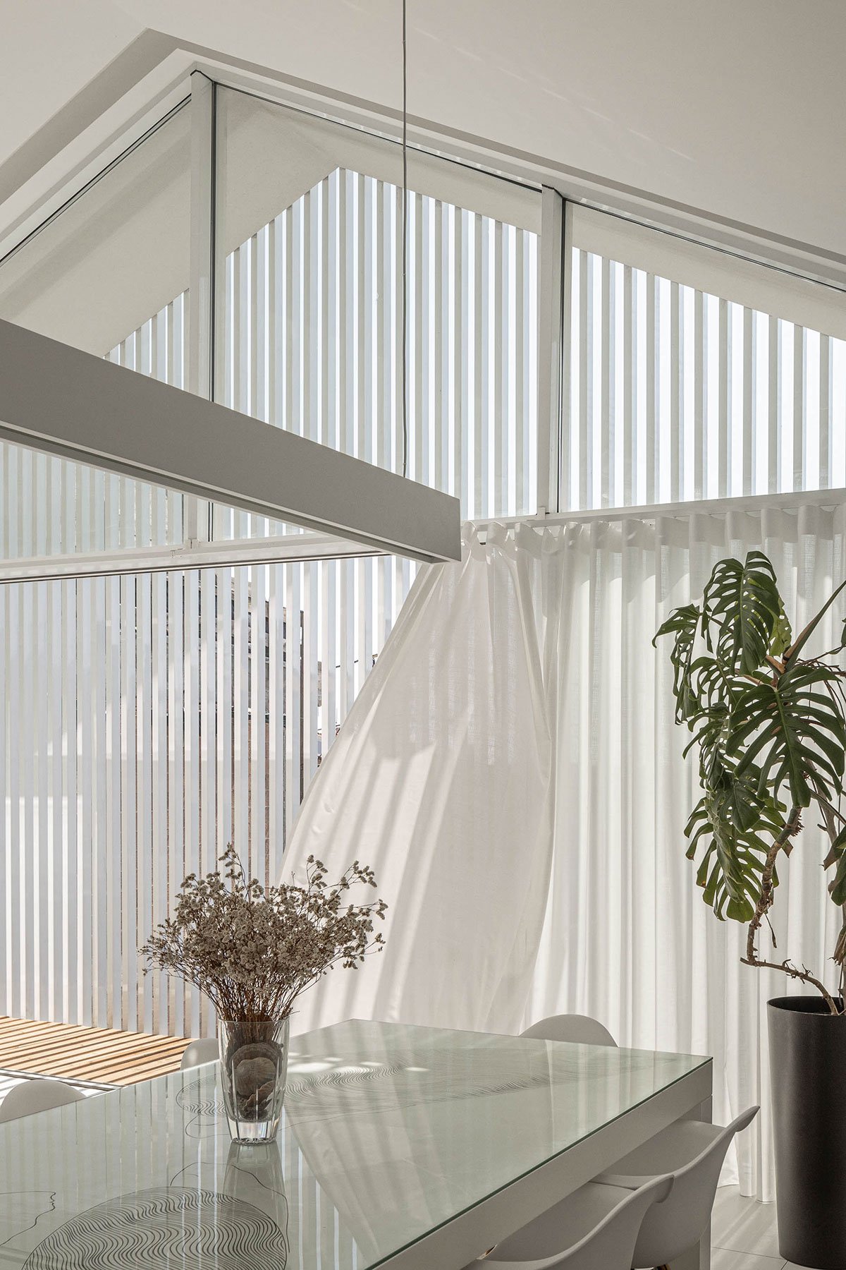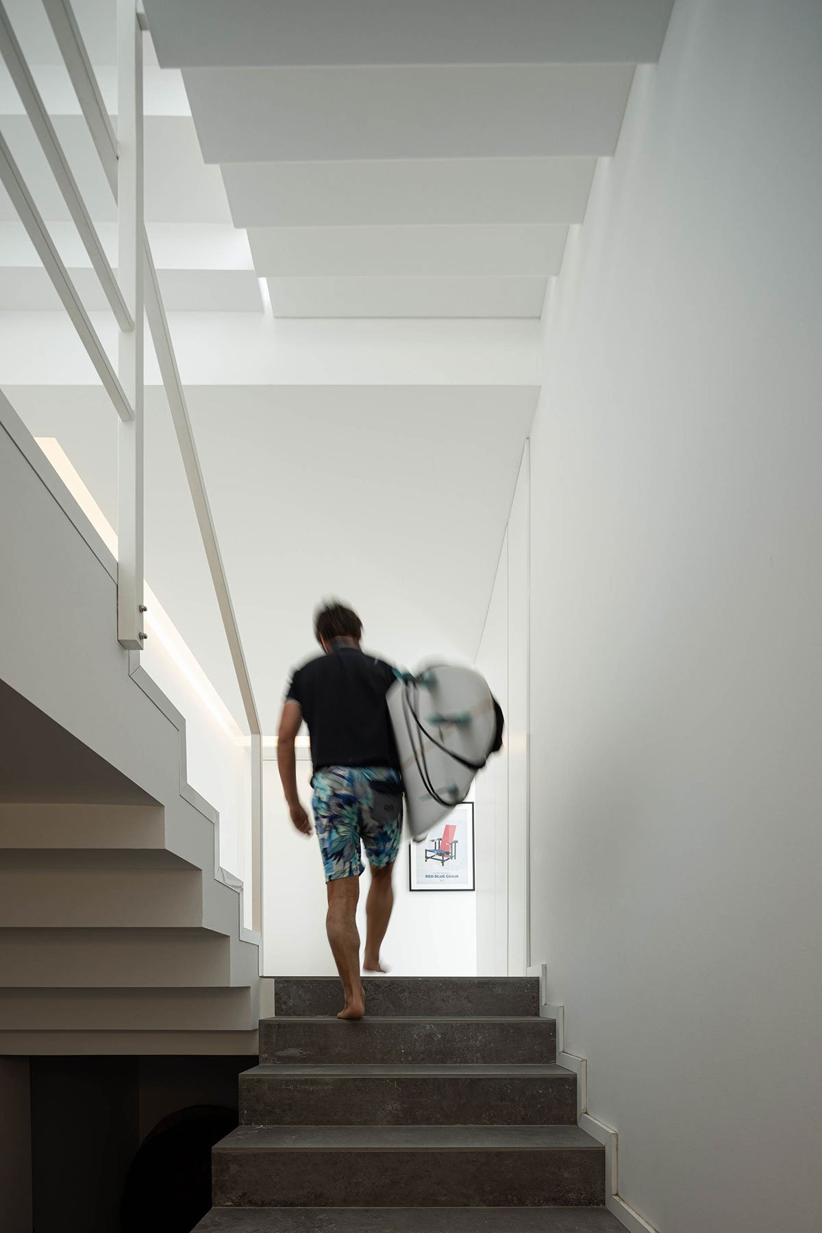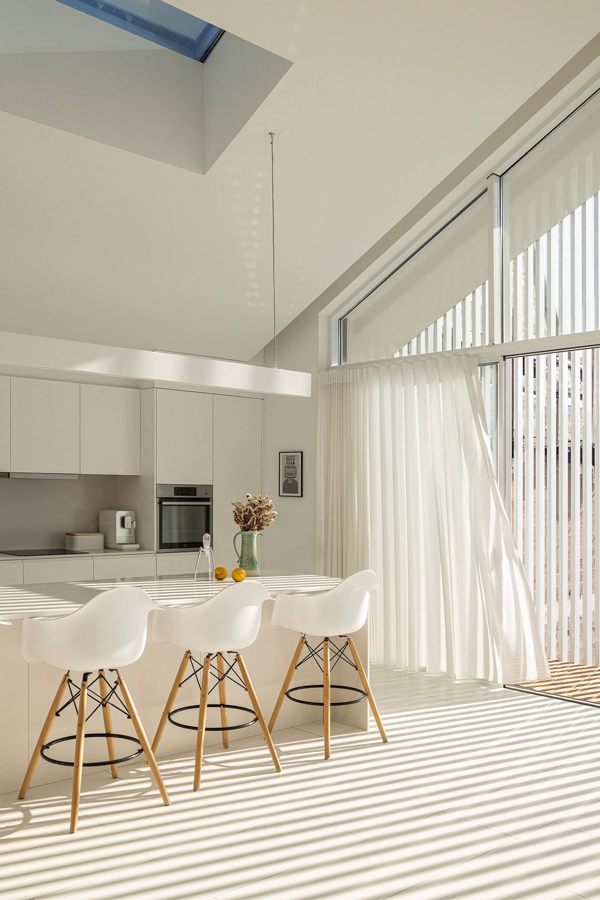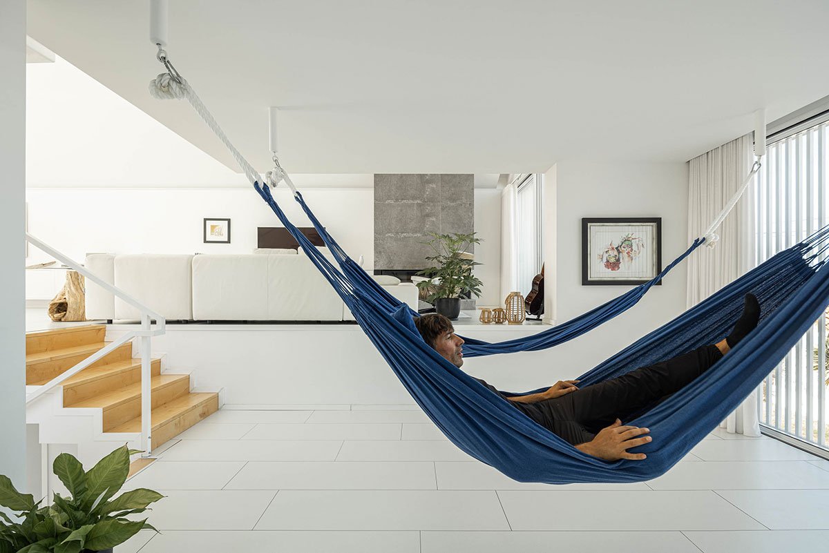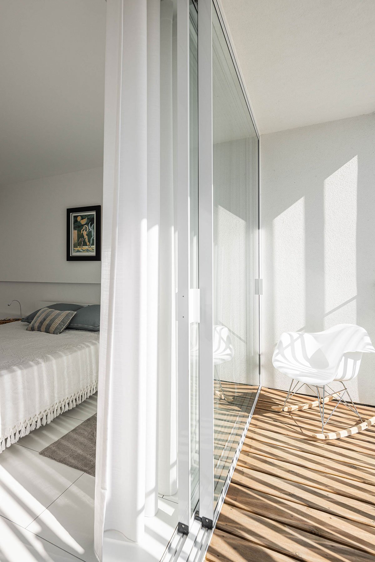 The social area was located on the upper floor, an area that was wide and with a very generous ceiling height, looking out over the estuary. Space to receive family and friends on festive days, articulated with the terrace on the roof, the lighthouse of the house, where the users can enjoy more.