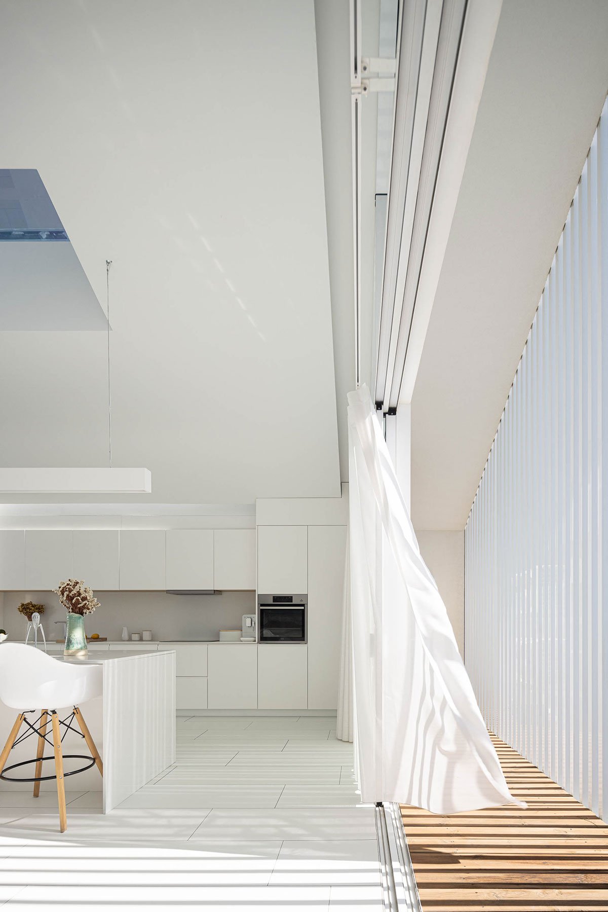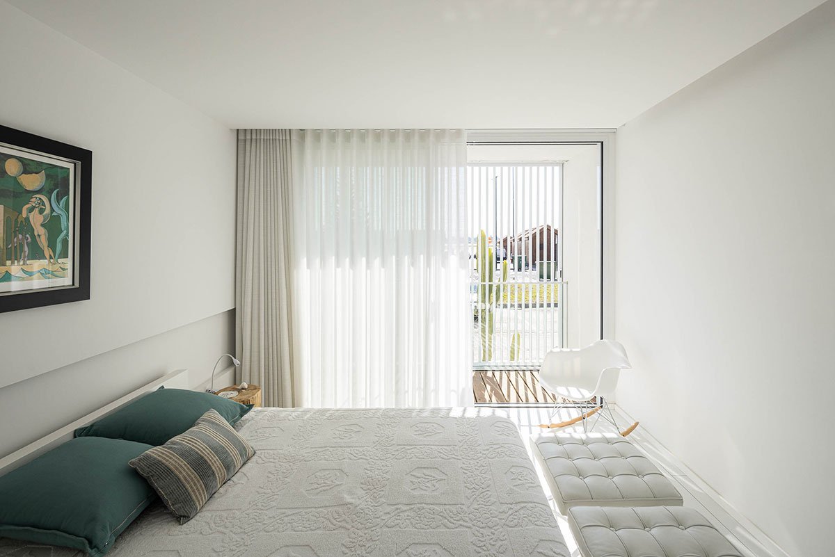 Excerpt: Casa Cor de Sal, a residence by Rómulo Neto Arquitetos LDA, features a design characterized by its marine environment. The house is built using ceramics, wood, and aluminum, with white as the dominant color. An interior patio is designed to connect with the southern facade, which allows natural light to flow into all areas, fostering a close connection between the indoor and outdoor spaces.