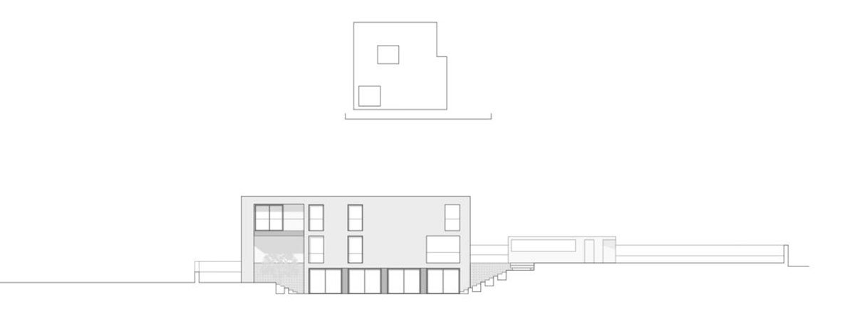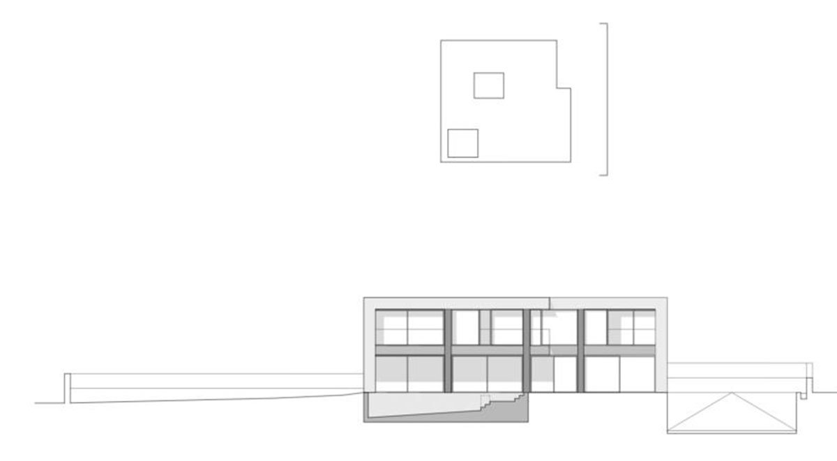 As if in contrast to the powerful main structure, an annexed horizontal pavilion emerges. Its exterior length delimits the pool and solarium areas, and inside, we find the barbecue area and outside washroom.