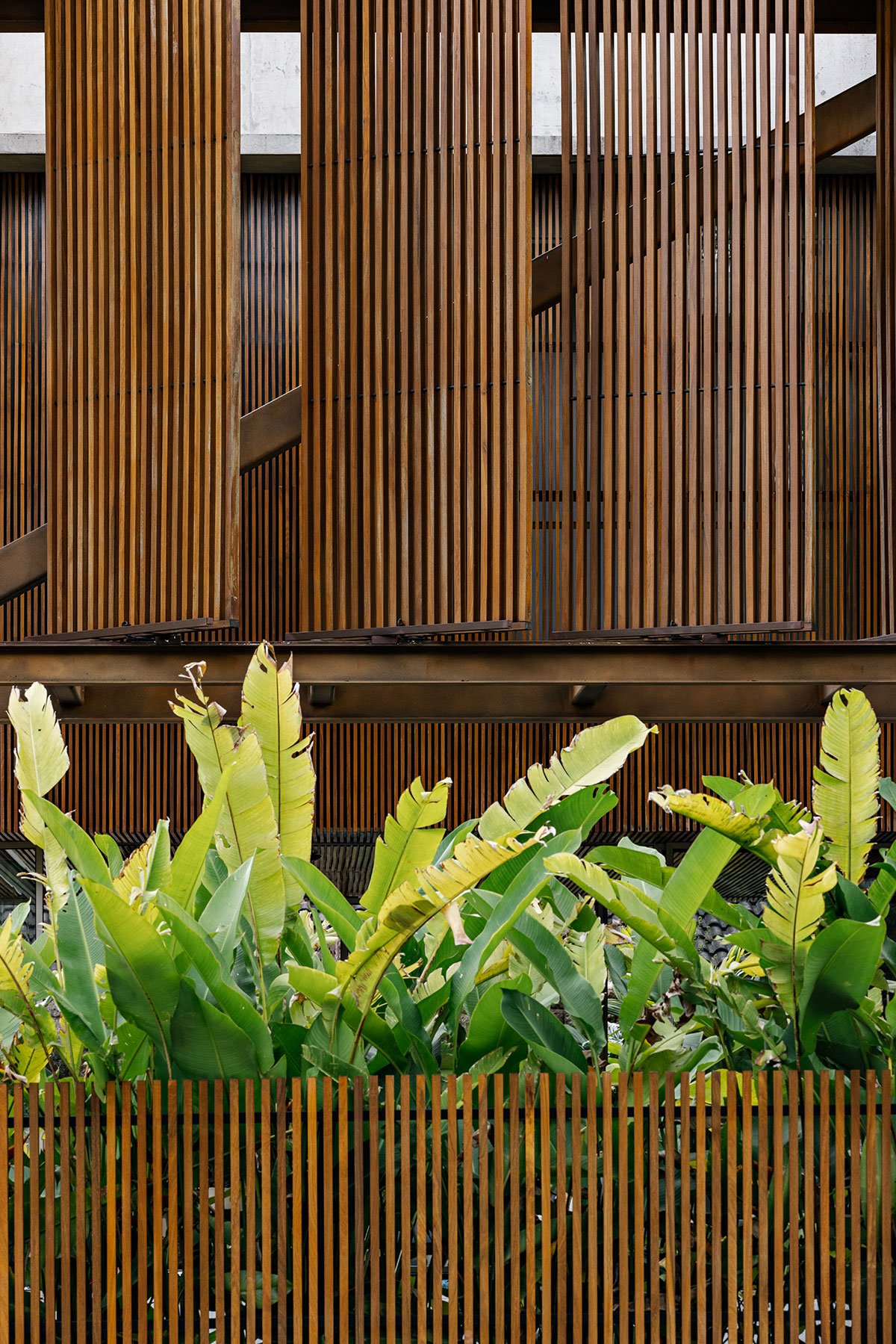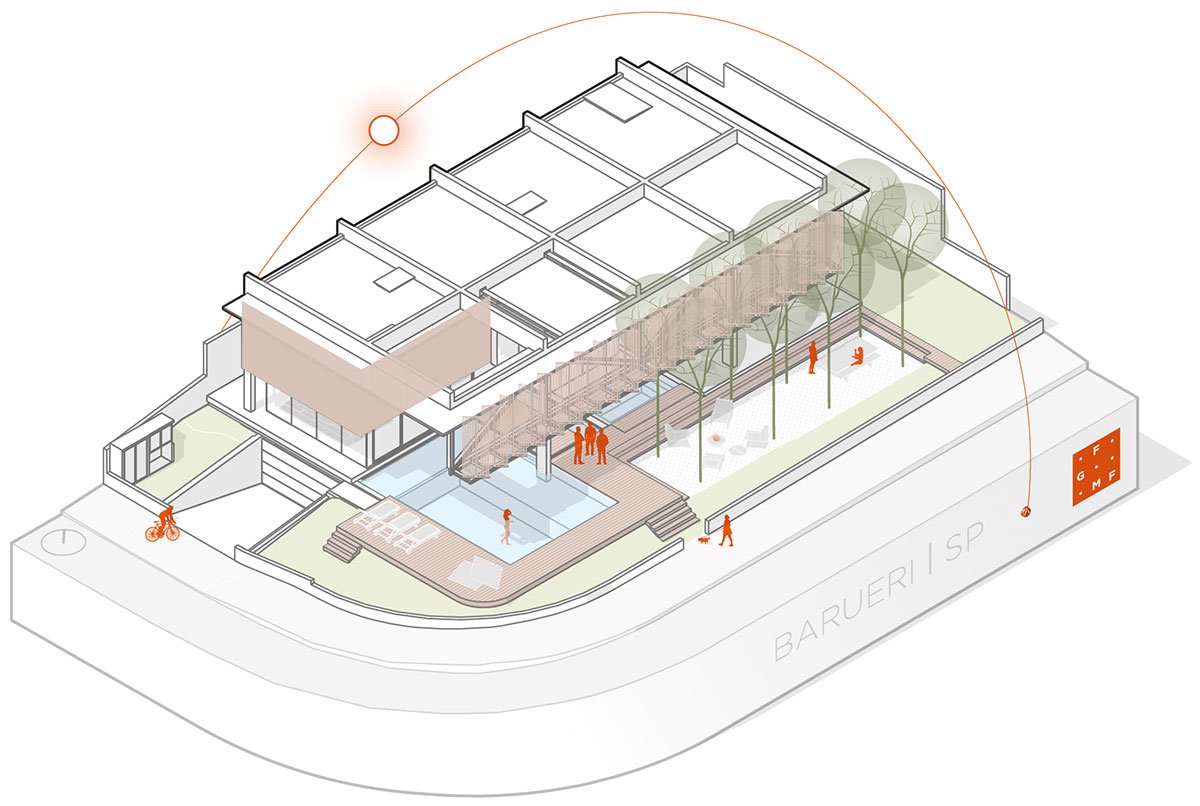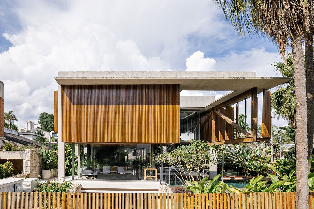 The extended program consists of living rooms, kitchen, balcony and sauna on the first floor, garage, service areas and technical areas in the basement and four suites, office and home theater on the upper floor. In addition to the structural system and the large glass panels, wood is a very prominent element in this house, appearing in the form of slatted cumaru wood cladding on the upper floor, shrimp-type doors in the bedrooms, mobile brises over the pool, wooden deck on the balcony and carbonized wood in the gourmet space.