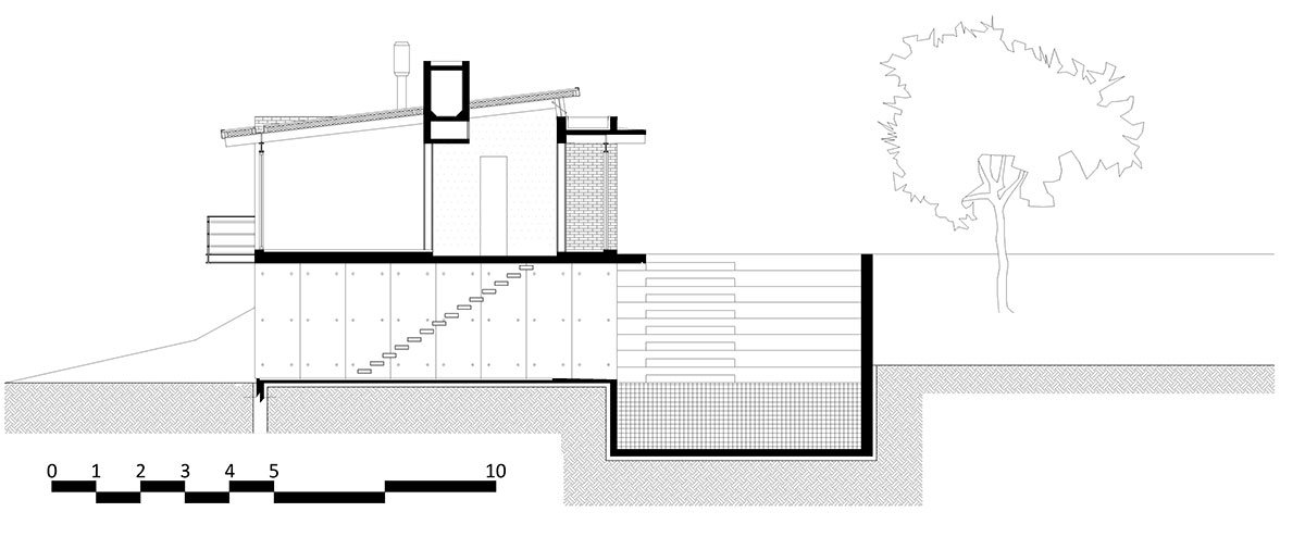 This base volume supports an exposed ceramic brick prism, covered by a single pitched roof, which contains the main functions of the house. Bedrooms, living, kitchen and dining are arranged in a modular and linear way in a pure rectangular plan. A transparent aisle, facing the pool and the front of the lot, serves the rooms while providing a walk very close to the outside.