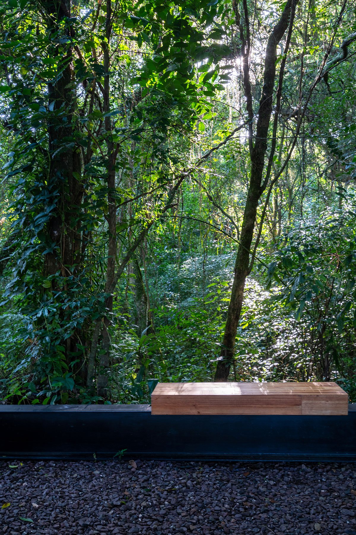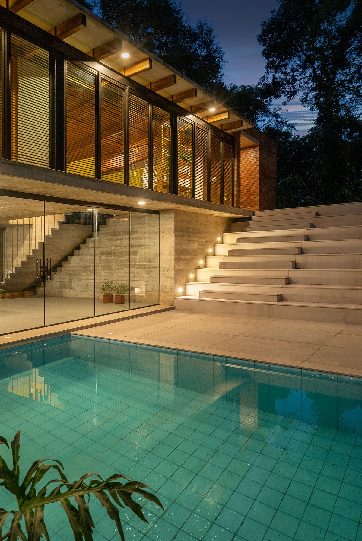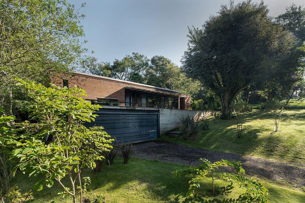 We chose to fit the house in the natural topography so that the rest and leisure areas could enjoy the best conditions of sunlight and, at the same time, be protected in privacy. So, we decided to organize the most permanent areas facing the forest, allowing close and constant contact with nature at all times. The functions are arranged in two pure volumes: the base in exposed concrete, adjusted to the topography and operated to accommodate the pool and solarium – in fact, a staircase with independent access to the leisure areas of the residence that also works as stands.