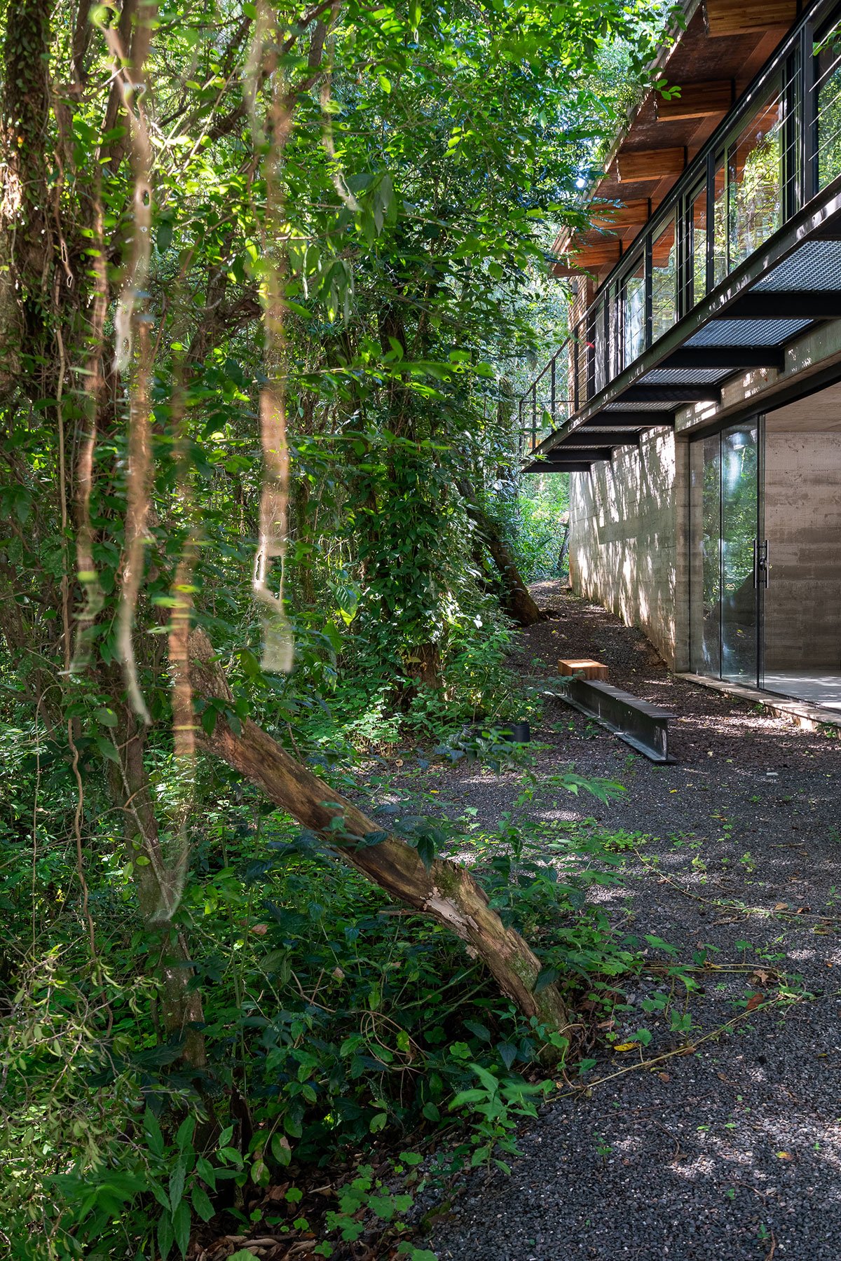 The demand was to design the family’s move from an urban apartment to a house close to nature. The house would be the beginning of life away from the city for a remote-working couple long before it became an almost normal condition. The site, with more than half of its total area preserved under permanent environmental protection regulations, had a regular and gentle slope parallel to the front alignment, and a huge ficus tree occupying the front portion of the plot.