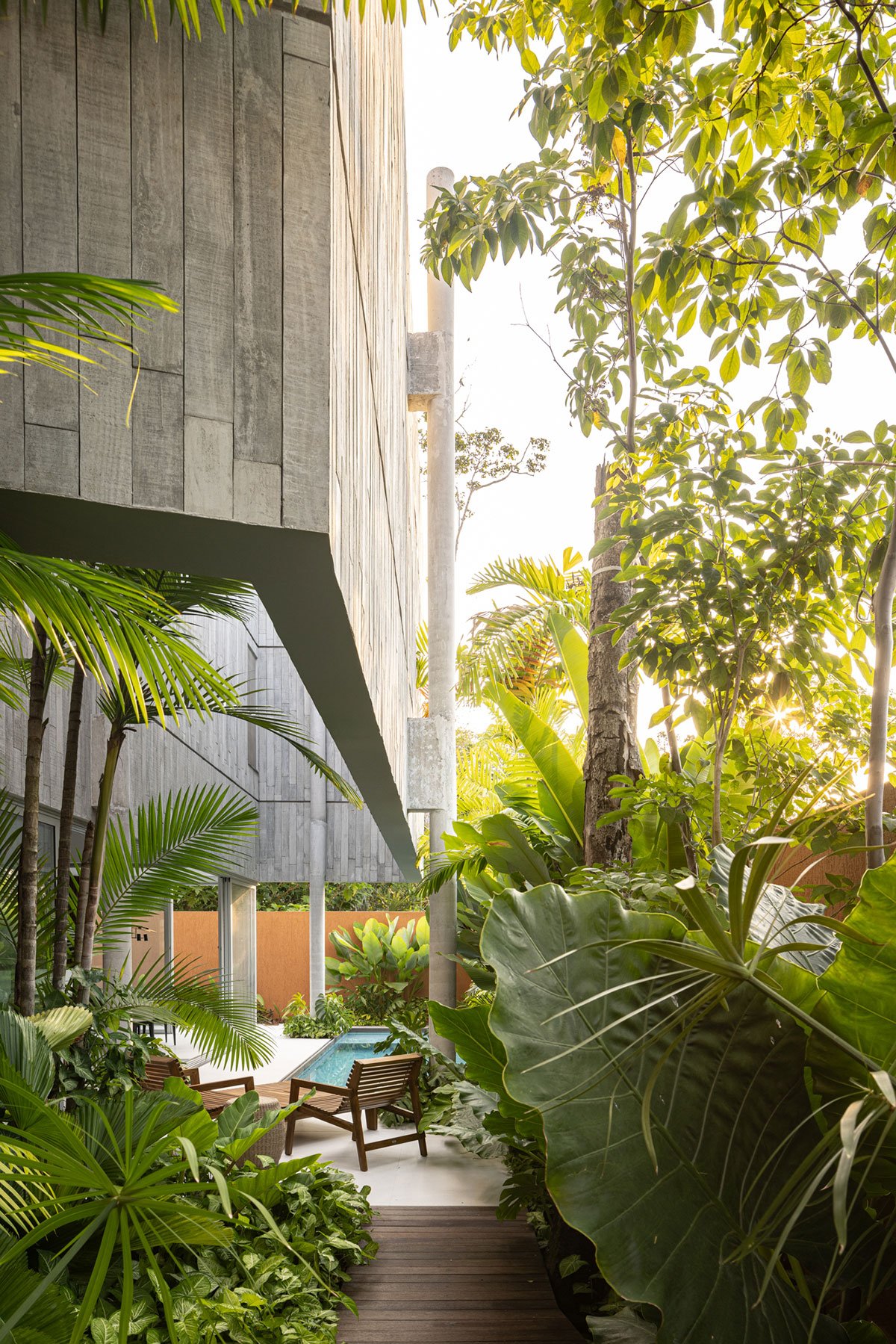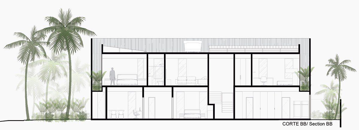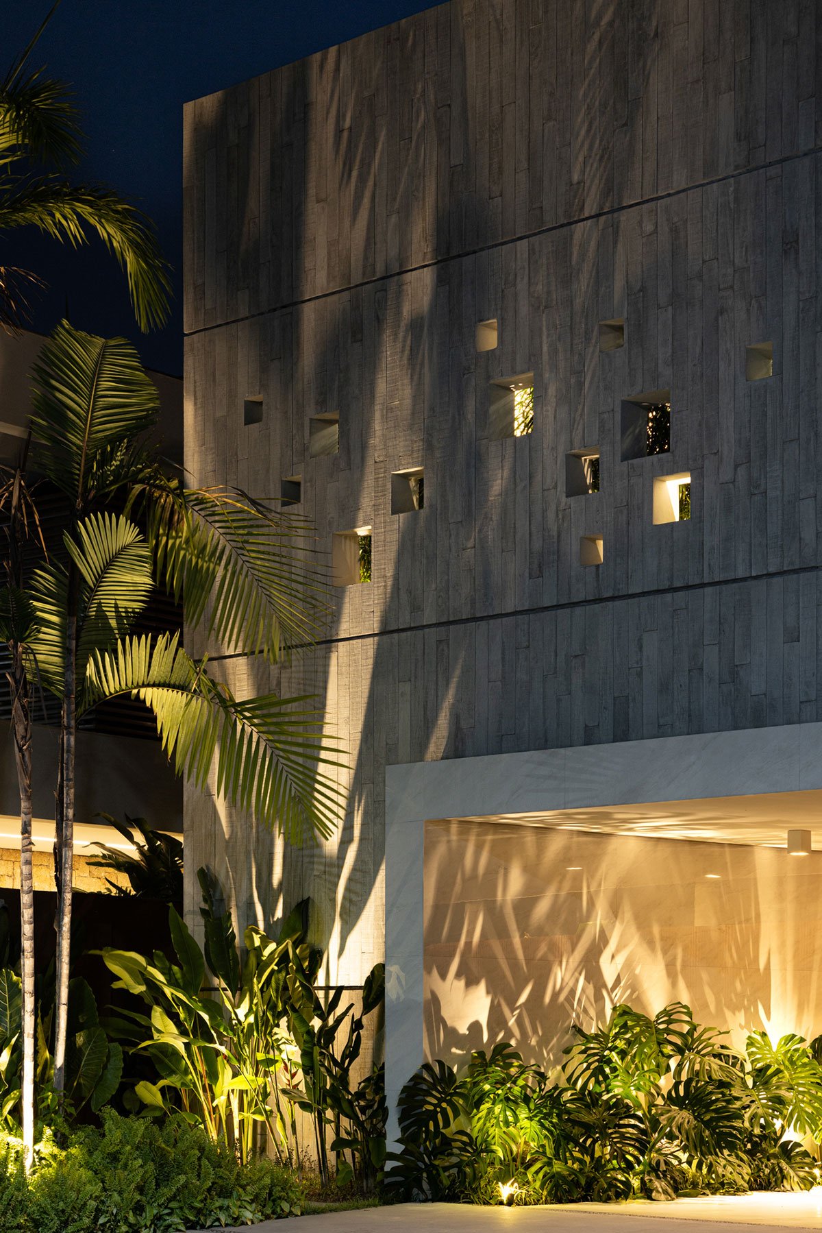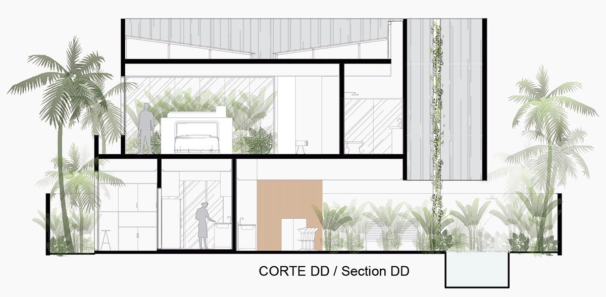 On the upper floor, one of the residents’ requests was for soft morning natural light to enter the master suite through small openings. In the afternoon, light is filtered to gently illuminate the daughter’s suite. The double concrete walls above the pool and in the upper gardens feature openings that allow air circulation, ensuring thermal comfort.