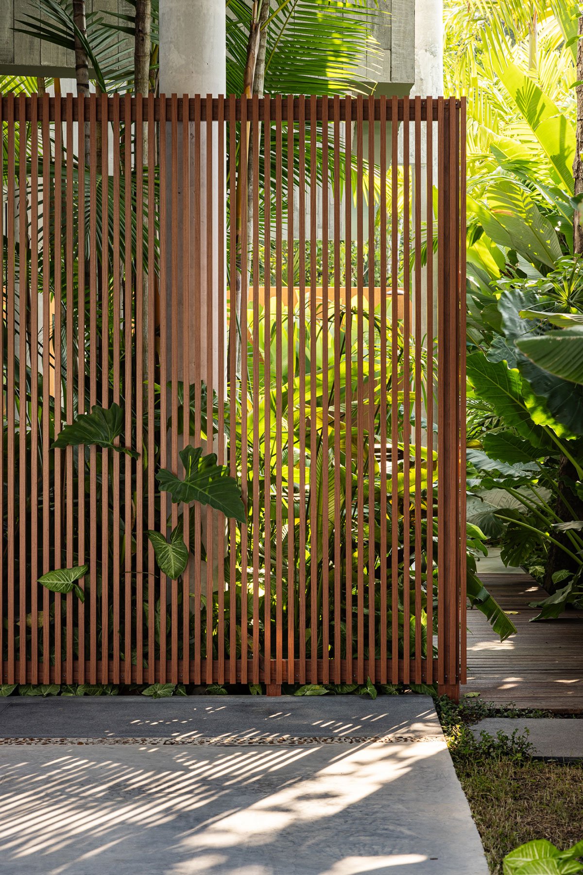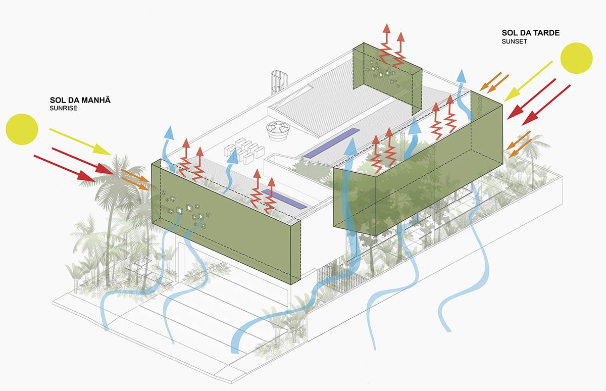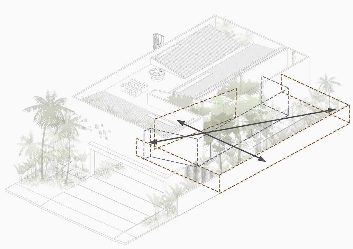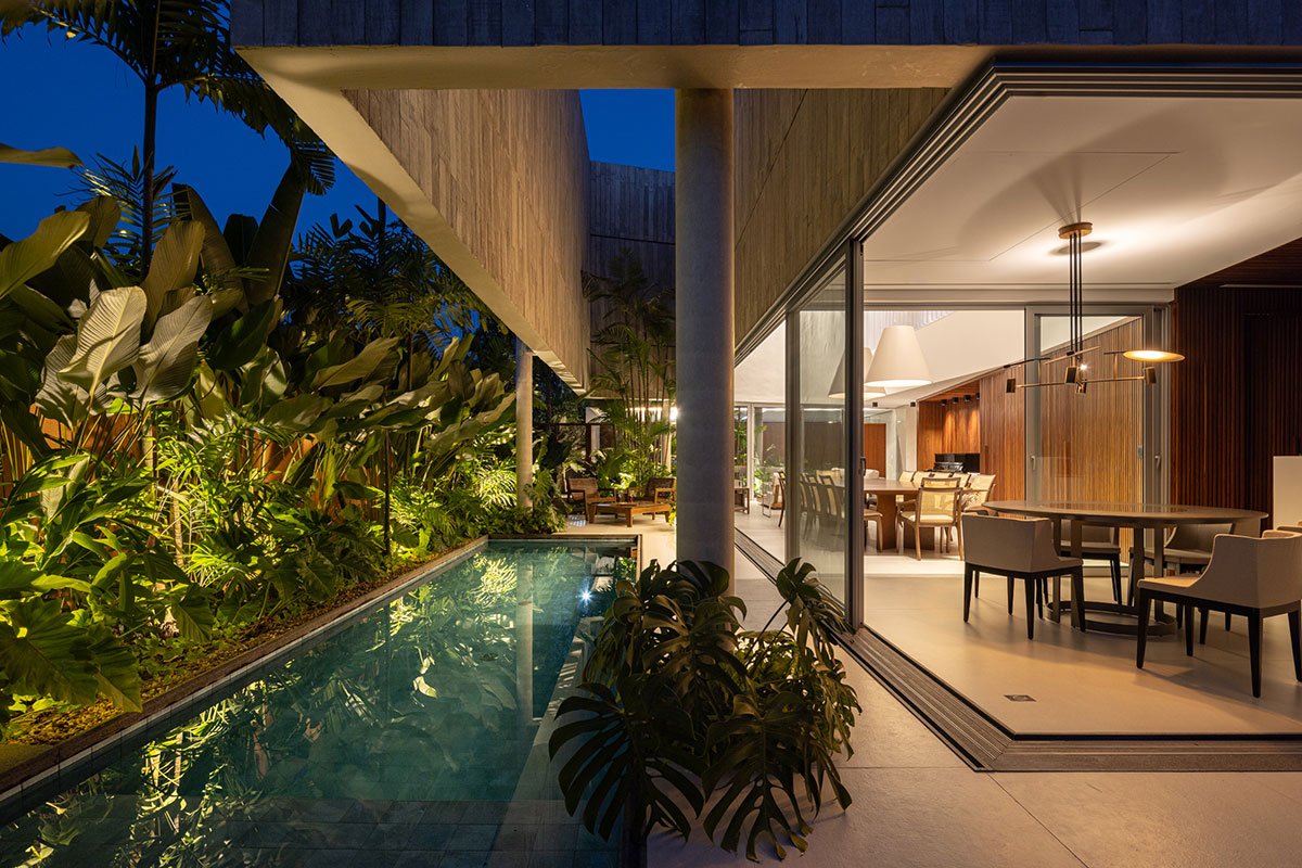 On the upper floor, one of the residents’ requests was for soft morning natural light to enter the master suite through small openings. In the afternoon, light is filtered to gently illuminate the daughter’s suite. The double concrete walls above the pool and in the upper gardens feature openings that allow air circulation, ensuring thermal comfort.