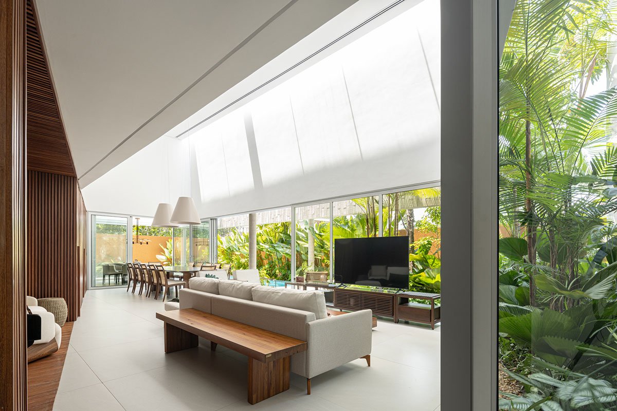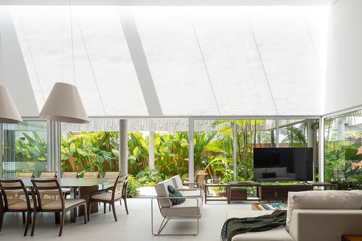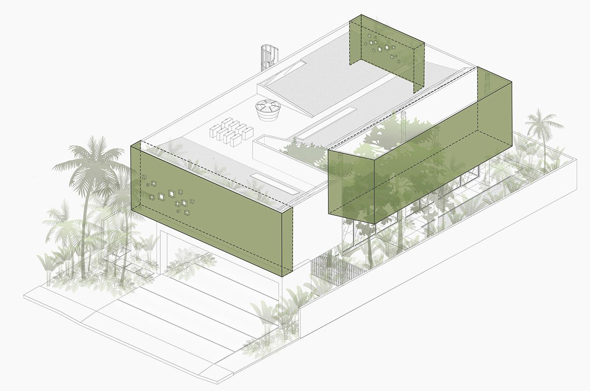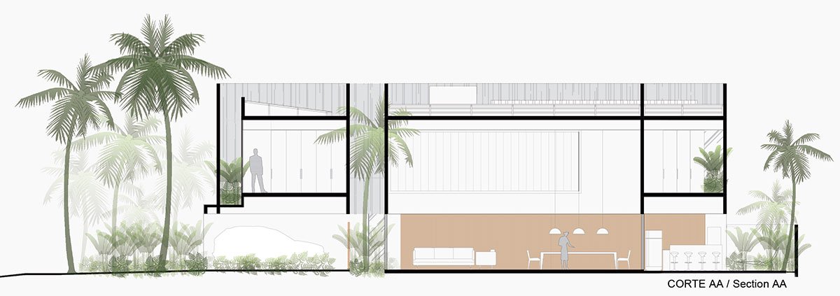 To prevent direct sunlight from entering the interior of the house, concrete walls were designed to filter the light before it reaches a glass wall positioned behind internal and external gardens located within cutouts in the concrete structure. Between the garage and the living room, as well as on the upper floors, the suite gardens offer views of the street and surrounding area while ensuring the necessary shading and preserving the site’s trees.