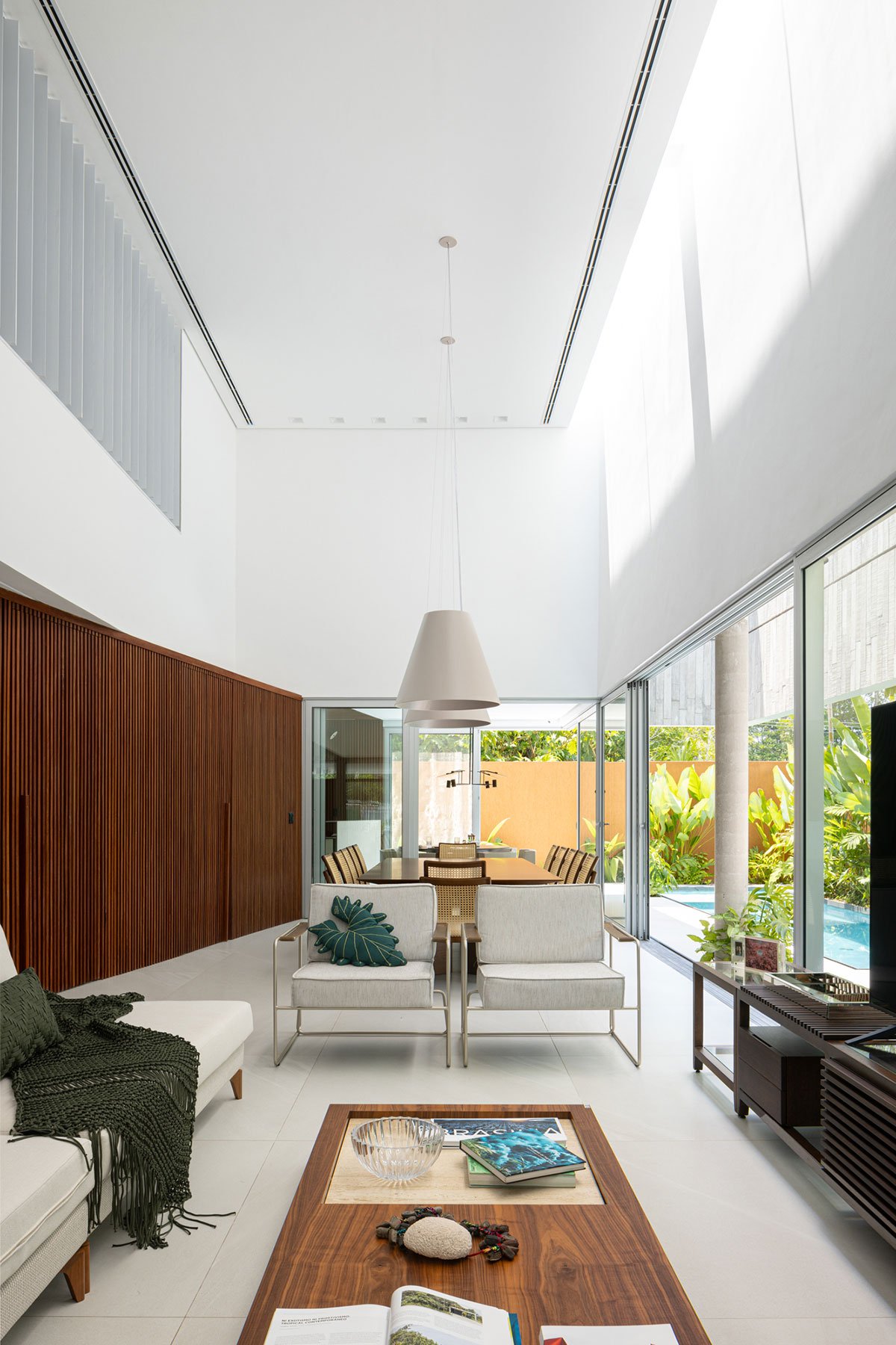 Inside, the living room was designed to integrate seamlessly with the garden at the property’s boundaries, maximizing the sense of spaciousness. A wooden panel occupies the southern side of the floor plan, providing privacy for specific areas such as the family’s piano space while also housing access to the upper floor, kitchen, and barbecue area. The remaining sections of the living room were kept open, enhancing the visual connection with the outdoors.