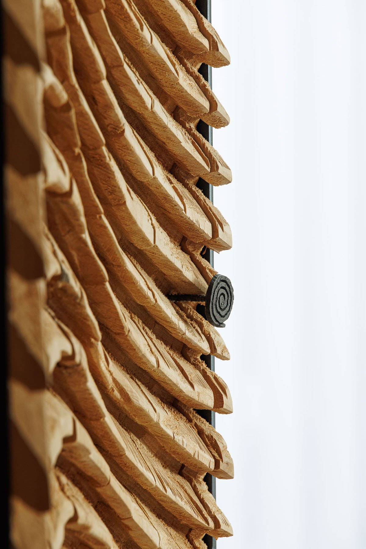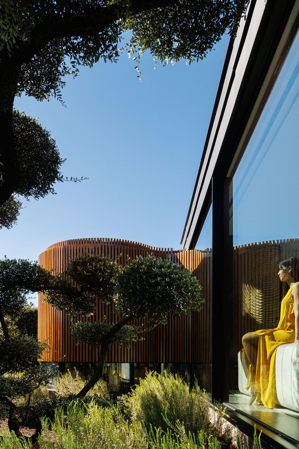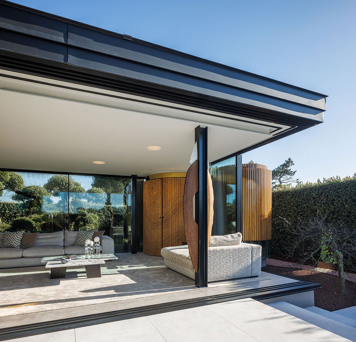 The exception to the rule is in the living room, which transforms itself into a porch. A sculpture by Paulo Neves when opened, gives us a wine tasting experience, a carved door, an organic feeling, which provides an amazing experience within the outside garden.