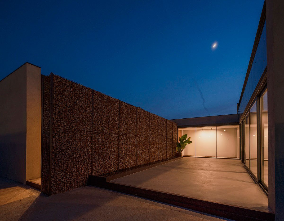 Another decision of the project was to create a privacy filter in the central patio of the living area. The result is a wall made of stone gabions that protects the most intimate part of the house and allows for the independent use of the other. This separation is further reinforced by the arrangement of the corridor structure, and the general outline of the house in the form of a hair comb. In this way, the two parts are joined without interfering. Thus, the main internal pathway is designed as a transit to the most private area. It starts from the entrance with a path crossing the basement patio, which acts as a moat here, clearly marking a difference between the public space on the street and the private space that makes up the house. Upon entering and crossing the day-zone, the pathway acquires a completely different characte , due to complete illumination and views of the central patio through the bay window. Thus, the corridor structure acquires other functions that give it interest and meaning.